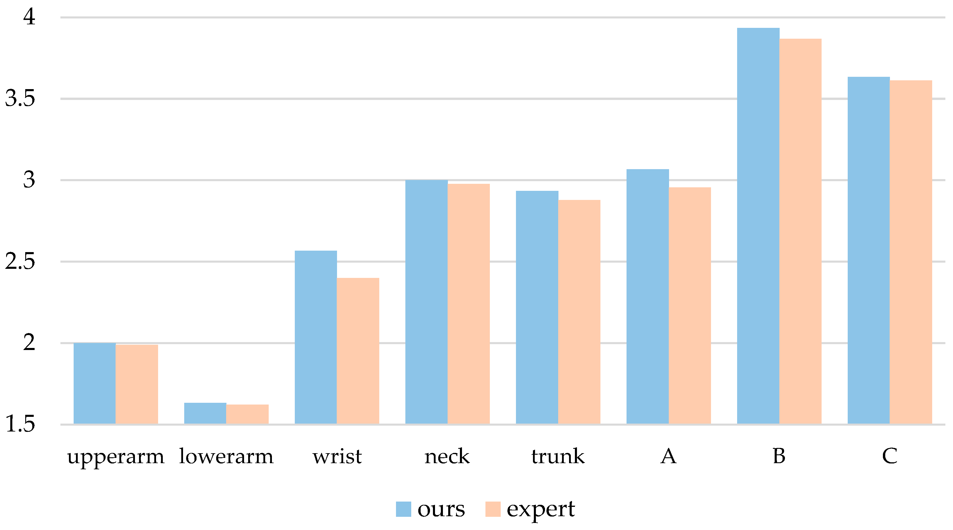 Table 7 presents the scores by three experts and our method. Cohen’s kappa co-efficient was used to further investigate the consistency of classification. All three scoring groups had high numerical consistency, with only a slight difference between Score A, Score B, and Score C. However, in terms of classification consistency and bias stability, there were some differences among them. The ICC between the system and three experts for Score A was 0.917, which means the system and experts had high numerical agreement. However, the Cohen’s kappa coefficient of Score A was 0.808, while those of Score B and Score C were higher than that of Score A. It means that the classification accuracy of Score A was slightly lower than that of Score B and Score C. Score A achieved a Cohen’s kappa coefficient of 0.808, while Score B reached 0.849, which was higher than 0.808. This advantage stems not from smaller fluctuations in the B score (2 or 4 points), but from fewer classification mismatches between the system and expert assessments. For example, in trunk angle evaluations, although system scores may differ from expert scores by 2 or 4 points, such mismatches occur less frequently. In contrast, Score A exhibited more frequent classification mismatches. A typical case occurs when a worker’s hand is facing the camera with the back of the hand visible: the system’s classification of “wrist” more frequently deviates from the category assigned by experts, as shown in