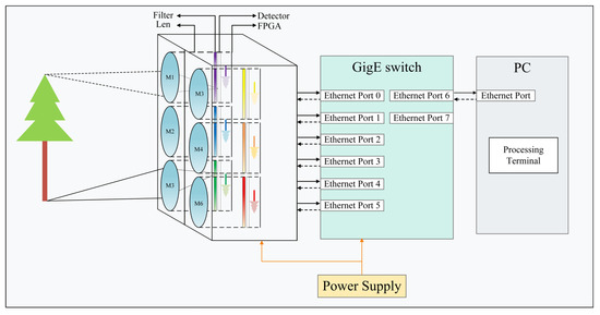 As shown in Figure 1, the MSI system presented herein is primarily composed of the following core components: a multispectral camera array equipped with distinct center-wavelength filters and interchangeable lenses, an industrial-grade GigE switch for data aggregation and real-time transmission, a host PC for data reception and image reconstruction, and a power module supplying energy to the system. M1-M6 represent the relative positions of each camera node. Each camera node integrates a narrowband optical filter, a fixed-focal-length lens, an IMX178 sensor, and a field programmable gate array (FPGA) for sensor control.