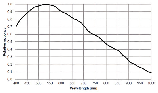 The choice of sensor is crucial in the design of a multispectral camera, directly dictating the imaging performance, overall system volume, and implementation complexity. Considering the demands for high resolution, broad spectral response, and cost-effectiveness across diverse application scenarios, this system employs the Sony IMX178 (Sony, Tokyo, Japan), which has the advantages of high resolution, high dynamic range, low readout noise, and a wide spectral range [34]. Its relative quantum efficiency curve is illustrated in Figure 2, which shows a spectral response across the 400–1000 nm wavelength range, reaching a peak around 520–530 nm and gradually decreasing at longer wavelengths. The sensor features an effective resolution of 3072 × 2048 pixels, a pixel size of 2.4 μm × 2.4 μm, an optical format of 1/1.8 inch, and utilizes a rolling-shutter mechanism. Its key technical parameters are summarized in Table 2.