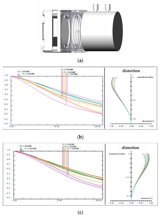 To ensure imaging quality, avoid vignetting or resolution loss caused by image-circle mismatch, and match the 1/1.8-inch optical format of the IMX178, two C-mount fixed-focal-length lenses (VM0820MP5 and VM1620MP5) from ZLKC (Guangzhou Zhisai Electronic Technology Co., Ltd., Guangzhou, China) were selected for the prototype: an 8 mm lens [35] and a 16 mm lens [36]. Their optical performances are shown in Figure 3b,c. For the 8 mm lens, the Modulation Transfer Function (MTF) curves are given at field heights TS = 0, 1.0, 2.5, 3.0 and 4.5 mm, i.e., from the image center to the rim of the 1/1.8″ format; at F2.0 the on-axis MTF stays close to 1.0 up to about 50 lp/mm and remains above roughly 0.35–0.4 at 100 lp/mm even at TS ≈ 4.5 mm. For the 16 mm lens, the MTF is plotted at TS = 0, 1.0, 2.8, 3.0 and 4.5 mm, likewise covering the whole usable image circle; its off-axis curves fall more slowly than those of the 8 mm lens and stay around 0.4 at 100 lp/mm at TS ≈ 4.5 mm, indicating that the longer-focal-length lens can better preserve fine detail of the 2.4-µm-pixel sensor. In practice, the 8 mm lens is used for wide-FOV, low-magnification or overview imaging, whereas the 16 mm lens is used for local, higher-resolution observation. Both lenses support manual focus and manual iris control, and have a maximum aperture of F2.0. In addition, the right-hand panels of Figure 3b,c show the corresponding distortion characteristics: the horizontal axis represents distortion in percent, and the vertical axis denotes the normalized exit-pupil radius, whose maximum value is 1. In both cases, the curves remain confined within ±0.1% over the full pupil. Detailed optical parameters for these lenses are presented in Table 4.
