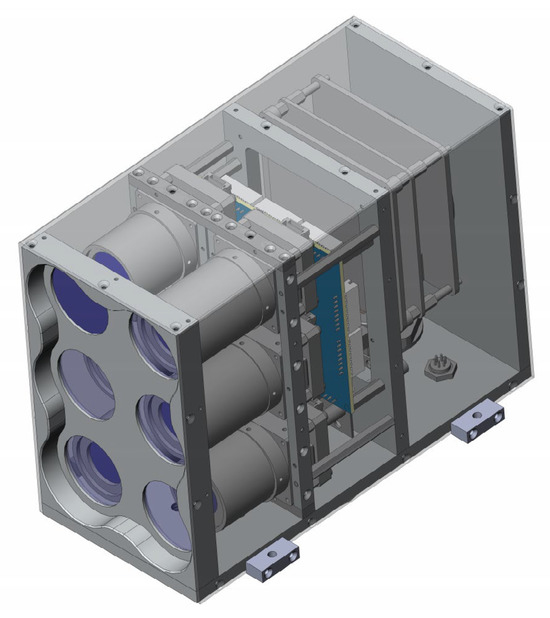 The system employs a unibody aluminum alloy housing, with its layout shown in Figure 4: the front section is dedicated to mounting optical components and sensing assemblies, while the rear section houses electronic elements. The front panel is designed as the optical datum of the system, featuring a precision-machined 2 × 3 array of six coaxial ports, each configured as a standard C-mount interface, with the detailed structure illustrated in Figure 3a. Behind each port, the narrowband filters are mounted via standard threaded interfaces directly in front of the sensor, which keeps the structure compact and enables quick filter replacement. The IMX178 carrier board and the FPGA-based sensor control board are mounted to the internal frame by means of hex standoffs and screws. To meet the stringent requirements for optical axis co-axiality, surface flatness, and shading margin at the front end, both the front panel and the lens barrel mounting plate are connected to the housing’s locating surfaces via countersunk screws.