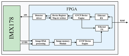 This section details the internal FPGA-based control architecture designed for each camera node, as shown in Figure 5. The architecture consists of four functional subsystems: (i) a sensor control module that drives the IMX178, executes SPI-based register configuration, and reports sensor readback data; (ii) a device register map and arbitration module that provides a unified register space, mediates accesses from the network side, and forwards detector-related writes to the sensor control module; (iii) an image reception and buffering module that acquires LVDS image data, performs image processing, and stores the data in onboard image memory; and (iv) a GigE Vision communication module composed of an Ethernet RX/TX path and a GigE Vision Control Protocol (GVCP)/GigE Vision Streaming Protocol (GVSP) device engine, which decodes GVCP commands from the host, generates GVCP acknowledgements, and packetizes buffered image data into Ethernet frames for transmission through the RJ45 interface.