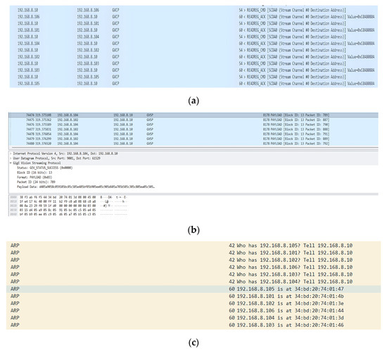 (a) GVCP data stream capture; (b) GVCP control stream capture; (c) ARP exchanges between the host and camera nodes capture.