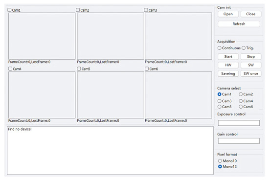 The software architecture detailed in Figure 10 is implemented as the host application’s main interface, shown in Figure 11. This interface, built as an MFC dialog, integrates all monitoring functions for the 2 × 3 camera array into a single window to achieve centralized supervision. The main body consists of six independent display panes, one for each node from Cam1 to Cam6, which provide visualization and display statistics. The control panel on the right provides direct access to core functions. Users can switch between nodes via camera select and independently adjust exposure control, gain control, and pixel format. These operations are ultimately translated by the Device management layer into GVCP access commands for the target node. Finally, the status bar at the bottom provides feedback on device enumeration and operational status.