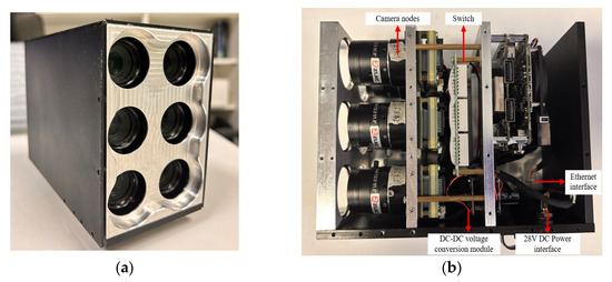 Figure 12a shows the physical prototype of the 2 × 3 multispectral camera array, and Figure 12b illustrates its internal layout. The hardware architecture is essentially consistent with that in Figure 4: within a compact enclosure, it integrates six camera nodes, a GigE switch, and a DC–DC power module. The unit is powered through a single 28 VDC input and uses one GigE port for both data and control.