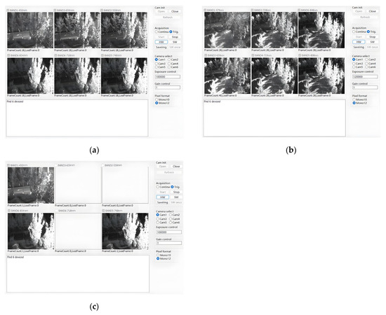 (a) Image acquisition using an 8 mm focal length lens and filter configuration 1; (b) Image acquisition using a 16 mm focal length lens and filter configuration 2; (c) Three-channel image acquisition using a 16 mm lens and filter configuration 2. In all subfigures, the spectral bands are labeled as BAND1–BAND6, where BAND1–BAND6 denote the first to sixth spectral channels, and the corresponding center wavelengths are listed in Table 3.