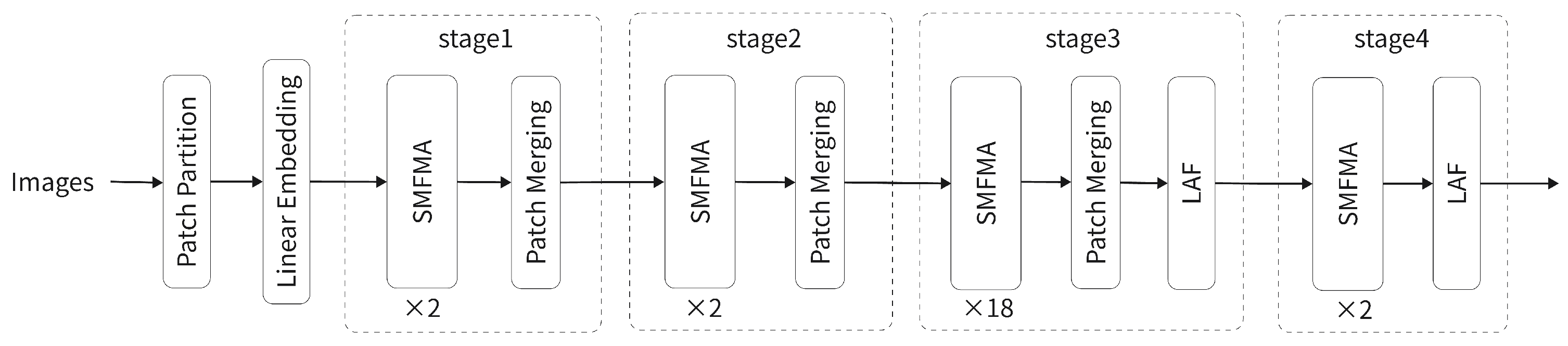 All experiments were conducted on a GeForce RTX 4090D GPU (NVIDIA, Santa Clara, CA, USA) with 24 GB of memory, and the models were implemented using the PyTorch 1.10.0 framework. Regarding weight initialization, we initialized the Swin-B backbone by loading pre-trained weights from the ImageNet-22k dataset, while for the newly added modules, we adopted PyTorch’s default Kaiming Normal Initialization method. After multiple rounds of manual hyperparameter tuning on the validation set, we determined a stable and optimal parameter configuration. During training, AdamW was adopted as the optimizer for the proposed MaLafFormer model. The training was performed for 100 epochs with a batch size of 32, an initial learning rate of 1 × 10