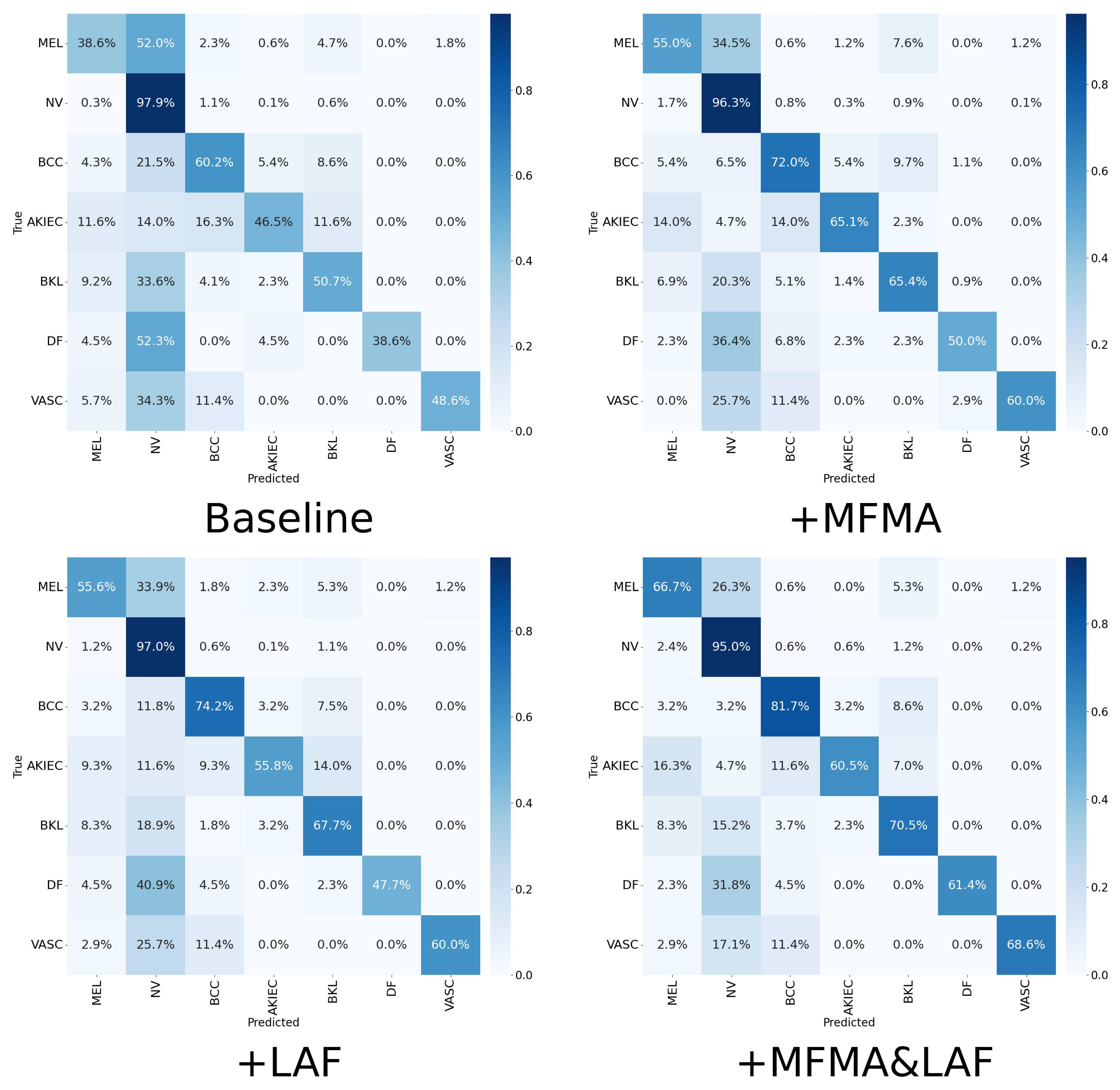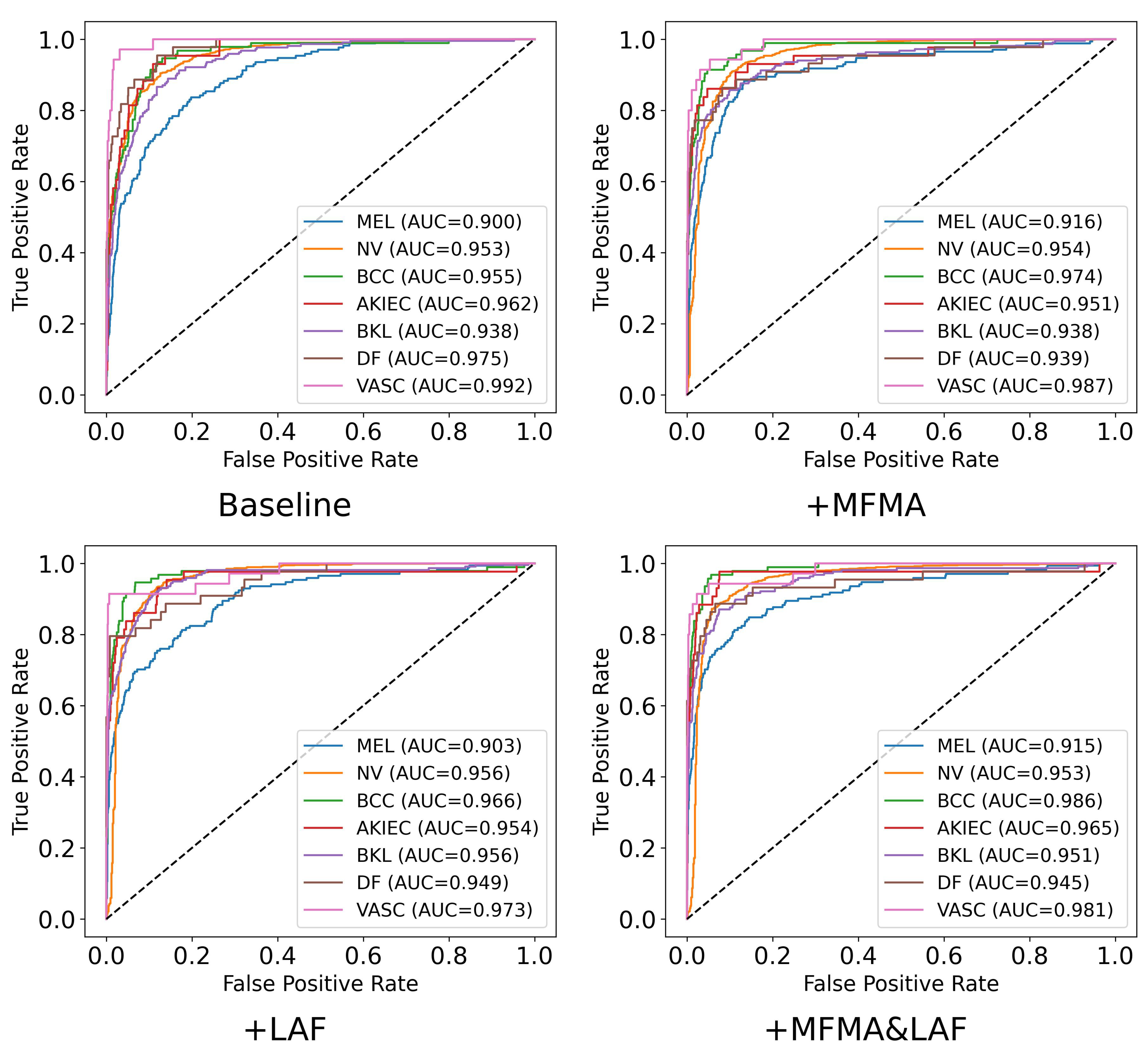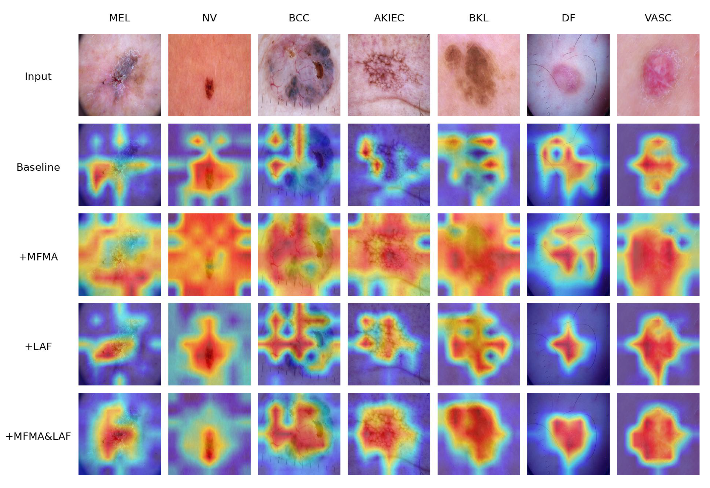 Figure 6 are from a single run with seed 42. As shown, when MFMA and LAF are introduced separately, the model achieves better classification metrics than the baseline model for most categories. For MEL, the baseline model achieves a recall of only 0.386, clearly exposing its substantial deficiency in identifying this key minority class. After introducing MFMA, the recall for MEL increases to 0.550, while incorporating LAF results in a recall of 0.556, demonstrating the effectiveness of both modules.