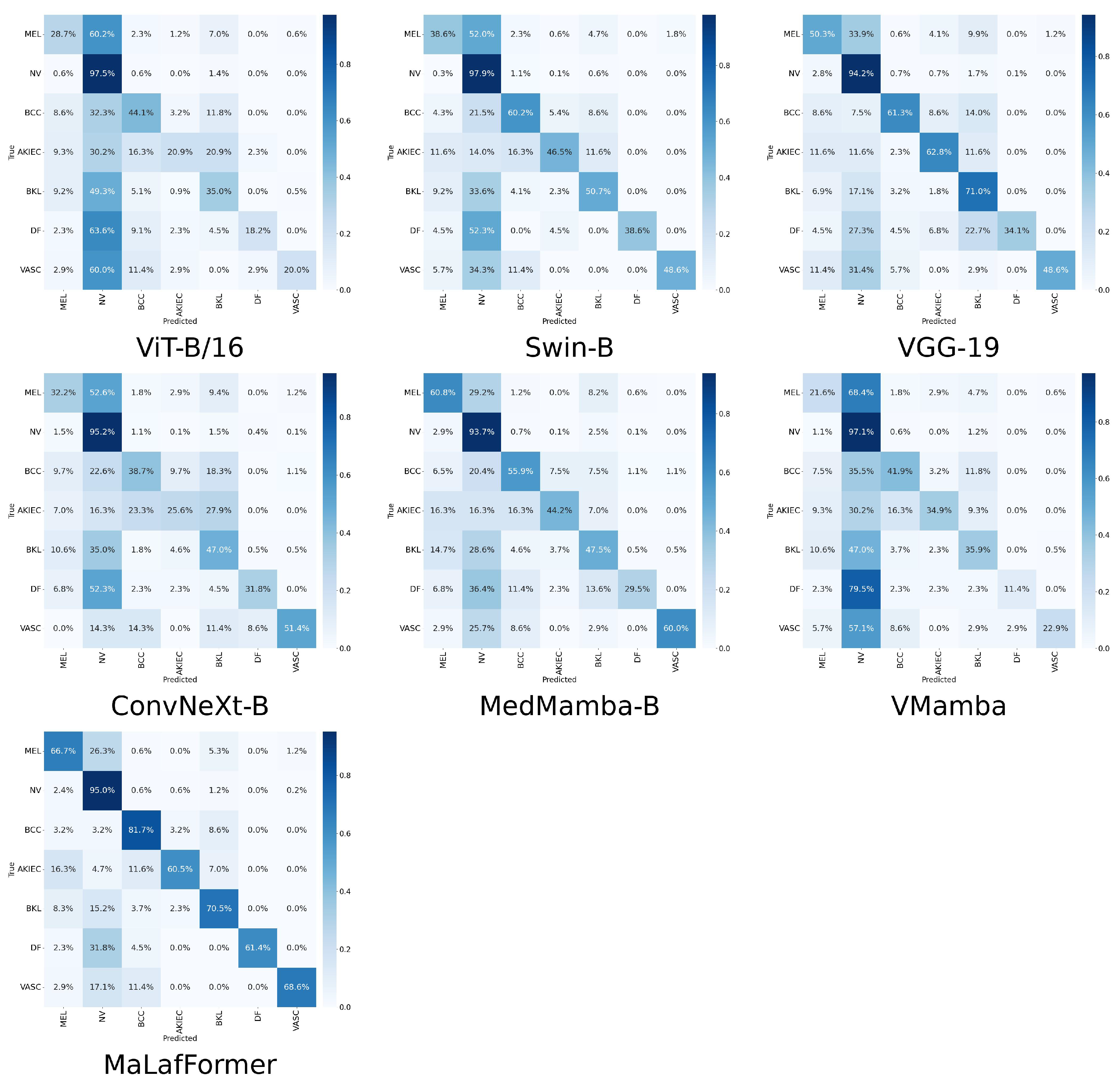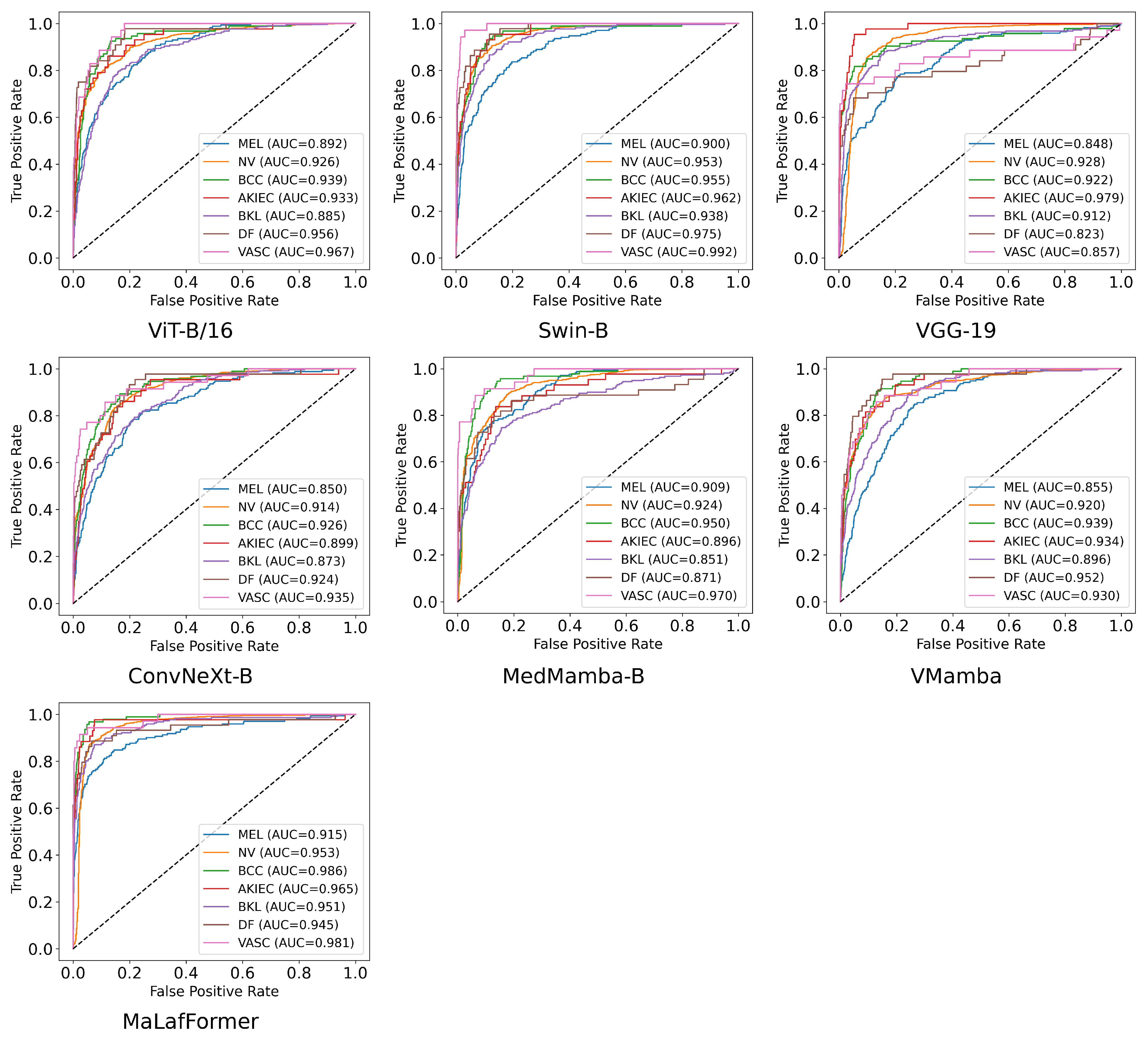 Figure 9. Overall, our MaLaFormer demonstrates leading performance across all categories, indicating a robust and generalized capability with no apparent weaknesses on this dataset. Specifically, for MEL, the category with the highest fatality rate, MaLaFormer achieves the highest scores in precision, recall, F1, and AUC while maintaining a specificity of 0.961. Compared to all competing models, MaLaFormer attains the highest specificity for the NV, which has the largest number of samples, suggesting its potential to effectively reduce unnecessary biopsies. Even for the categories with extremely limited samples, namely DF and VASC, our model maintains a recall greater than 61%, confirming its sensitivity to rare lesions. In contrast, models such as VGG-19, ConvNeXt, and MedMamba exhibit relatively low precision and recall rates for most categories. Meanwhile, ViT and Vmamba appear to be significantly influenced by the majority class, resulting in degraded classification performance for other classes.