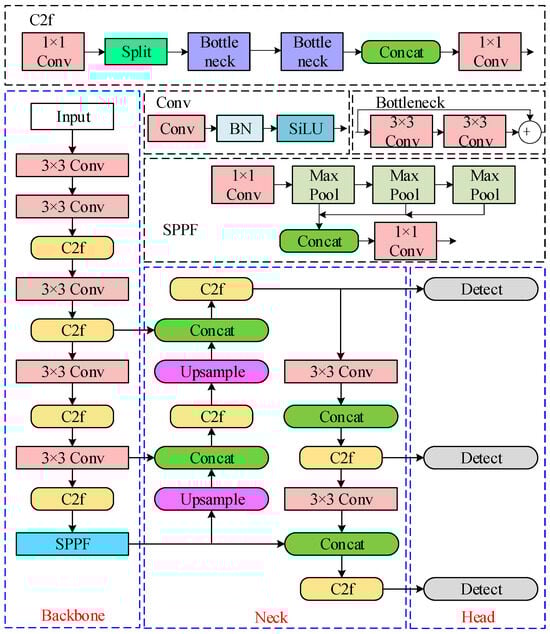 The YOLOv8 model is a widely used algorithm in the field of object detection, with YOLOv8s being a smaller version that better balances model size and computational complexity, while achieving high processing speed on edge devices. Given that bird faults occur rapidly on transmission lines, the YOLOv8s model offers a significant advantage in this context. The structure of the YOLOv8s model, as shown in Figure 1, follows the typical encoder–decoder architecture and consists of Backbone, Neck, and Head components. The Backbone primarily utilizes the CSPDarknet structure to extract multi-scale features from images, the Neck employs PANet to process targets of different sizes and perform feature fusion, and the Head is responsible for target classification and bounding box regression. However, when using the traditional YOLOv8s model for bird species detection on transmission lines, issues such as insufficient feature extraction arise, impacting the detection of small targets, and the model also struggles with processing complex backgrounds [18].