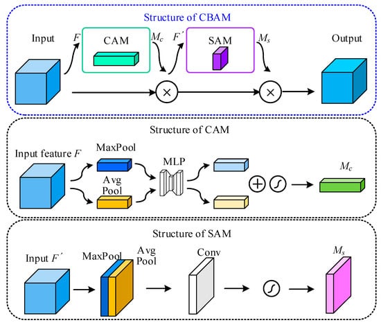 To enhance the model’s sensitivity to small targets in complex backgrounds, we integrated the Convolutional Block Attention Module (CBAM) into the Backbone. While lightweight mechanisms like Squeeze-and-Excitation (SE) focus solely on channel relationships, bird detection on transmission lines requires suppressing complex spatial backgrounds (e.g., towers, forests). CBAM effectively addresses this by inferring attention maps along two separate dimensions: channel and spatial, making it superior for locating small targets. The CBAM process consists of two sequential sub-modules: the Channel Attention Module (CAM) and the Spatial Attention Module (SAM).