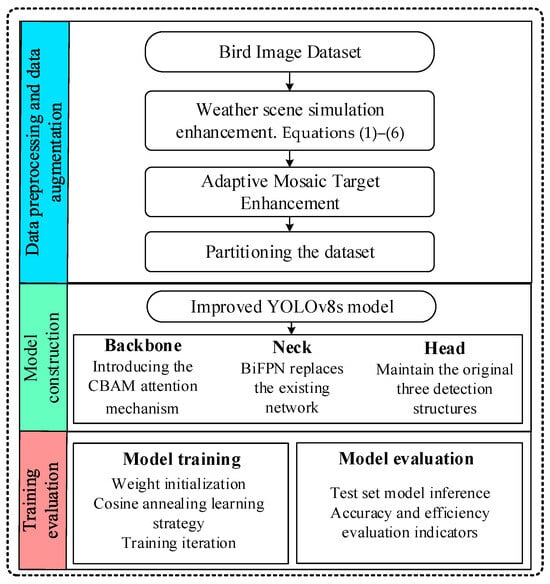 The bird species detection and identification method for transmission lines proposed in this paper is based on dual data enhancement and an improved YOLOv8s model, with the overall process shown in Figure 4.