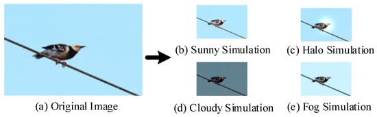 In the practical application of bird species detection on transmission lines, the images captured by monitoring systems are often affected by changes in weather and lighting conditions. The data enhancement effect of weather scenario simulation is shown in Figure 5, including sunny, cloudy, foggy, and halo effects, respectively. By introducing different weather scenarios into the original images, the model is able to extract key features of bird species under various conditions, thereby improving the robustness and generalization ability of the model in real-world applications.