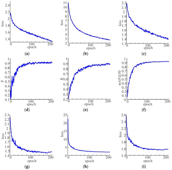Training curves of improved yolov8s model: (a) Training set bounding box regression loss; (b) Training set classification loss; (c) Training set freeform deformation loss; (d) Validation set accuracy curve; (e) Validation set recall curve; (f) Validation set mAP@50 curve (g) Validation set border regression loss (h) Validation set classification loss; (i) Validation set freeform deformation loss.