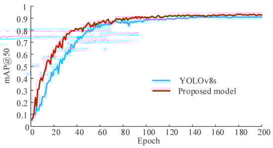 The iterative training process of the proposed improved YOLOv8s object detection model is shown in Figure 7. In the first 100 iterations, the loss curves for both the training and validation sets decrease rapidly, while the mAP@50, Precision (P), and Recall (R) curves are unstable. As the number of iterations increases, these curves flatten, indicating that the model is approaching convergence. Throughout the training process, there is no noticeable overfitting or underfitting. To verify the performance of the improved model, the original YOLOv8s model is also trained for the same number of iterations. The mAP@50 iteration curves for both models are shown in Figure 8, which demonstrate that the improved model achieves higher accuracy on the validation set and converges more quickly compared to the traditional model. When a small target bird image is input into both models, the output results, displayed in Figure 9, show that the improved model has a clear advantage in detecting small targets, with fewer missed detections compared to the YOLOv8s model, thus validating the effectiveness of the proposed method.