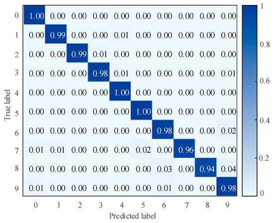 To further analyze the classification performance of the model on successfully detected targets, we generated a normalized confusion matrix, as shown in Figure 9. The confusion matrix measures the classification accuracy of detection results with IoU ≥ 0.5. The graph indicates that the classification accuracy of most categories is above 95%, indicating that the model has strong ability in category discrimination. However, specific misclassifications reveal the challenges posed by visual similarities and environmental factors. As shown in Figure 9, there is a significant misclassification phenomenon among the Big billed Crow (label 8), Magpie (label 6), and Swallow (label 9), with a maximum value of 4%, likely attributed to their shared black plumage and similar body contours.
