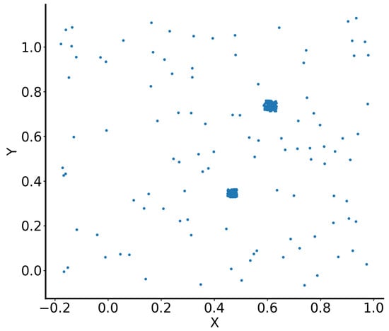 This section presents an analysis of synthetic two-dimensional data consisting of 303 points. The dataset forms two clusters (blobs), with the remaining points scattered and classified as noise. This dataset was created by Zelnik-Manor and Perona [96], who applied self-tuning spectral clustering to segment the data into three clusters: two representing the dense blobs and a third capturing the scattered noise points (Figure 2).