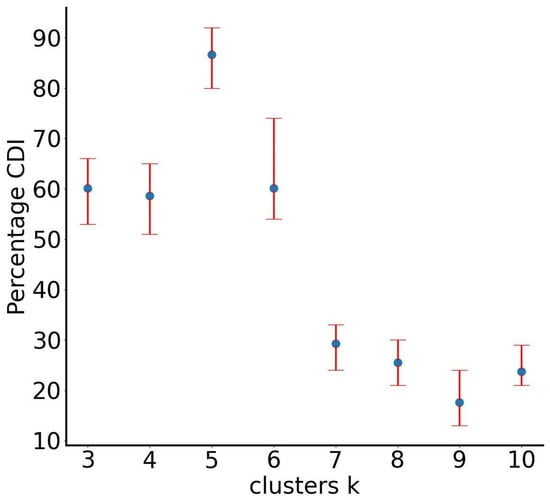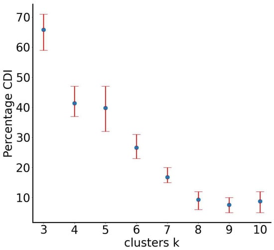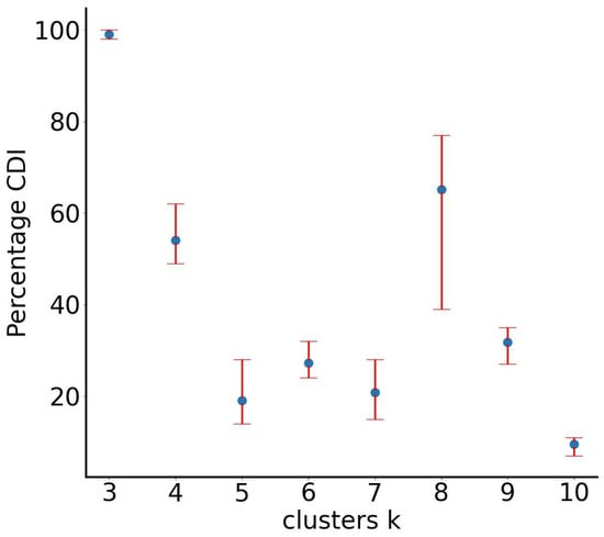 RUN-ICON predictions for the optimal number of clusters for the “noisy” dataset. Different numbers of clusters have been considered, and their CDIs are plotted along with their corresponding uncertainties.