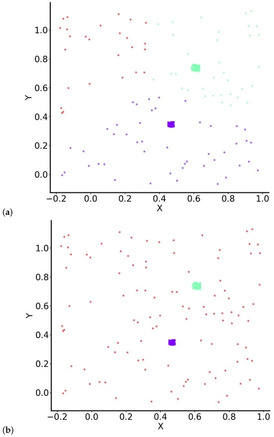 However, when the second component of the SUN algorithm, the Gaussian Mixture Model (GMM), was utilised, the clustering outcome improved significantly. In this instance, the three clusters comprised the two blobs and the noise as a separate category. The GMM component enabled the algorithm to better capture the data’s underlying distribution, resulting in clearer separation between the structured clusters and the noise points. The corresponding clustering results are illustrated in Figure 4b.