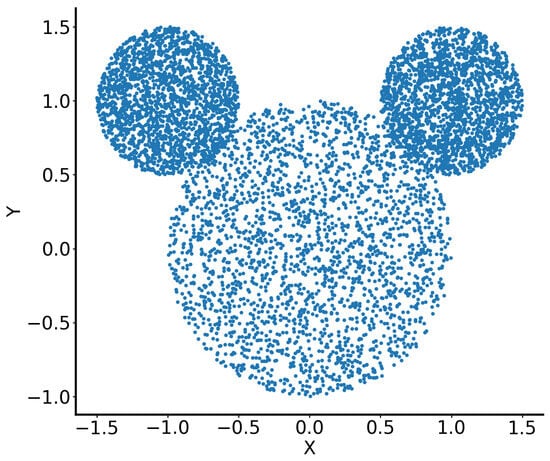 The dataset consists of 6648 points in (x, y) space, which represented the head of Mickey Mouse, i.e, one central circle representing the “face” (3805 points) and two smaller circles, symmetrically attached to the bigger one, representing the “ears” (left “ear”: 1468 points, right “ear”: 1375 points). All data points within the three circles were generated randomly (Figure 5).