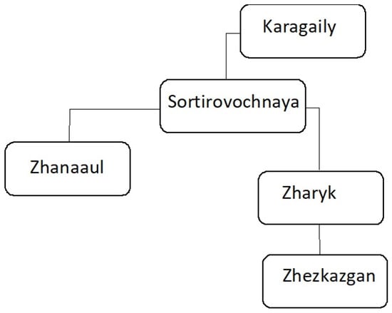 The redistribution model is based on a centralized inventory management scheme. Sortirovochnaya functions as the main hub where all surplus spare parts from peripheral stations are consolidated. The peripheral stations keep only their minimum safety stock and submit a request to the central hub when additional parts are needed. The required components are then dispatched from the hub to the requesting stations as necessary. This centralized scheme ensures unified control over spare part flows across the network and eliminates the unnecessary duplication of inventory. The spatial arrangement of the stations and redistribution routes is shown in Figure 1.