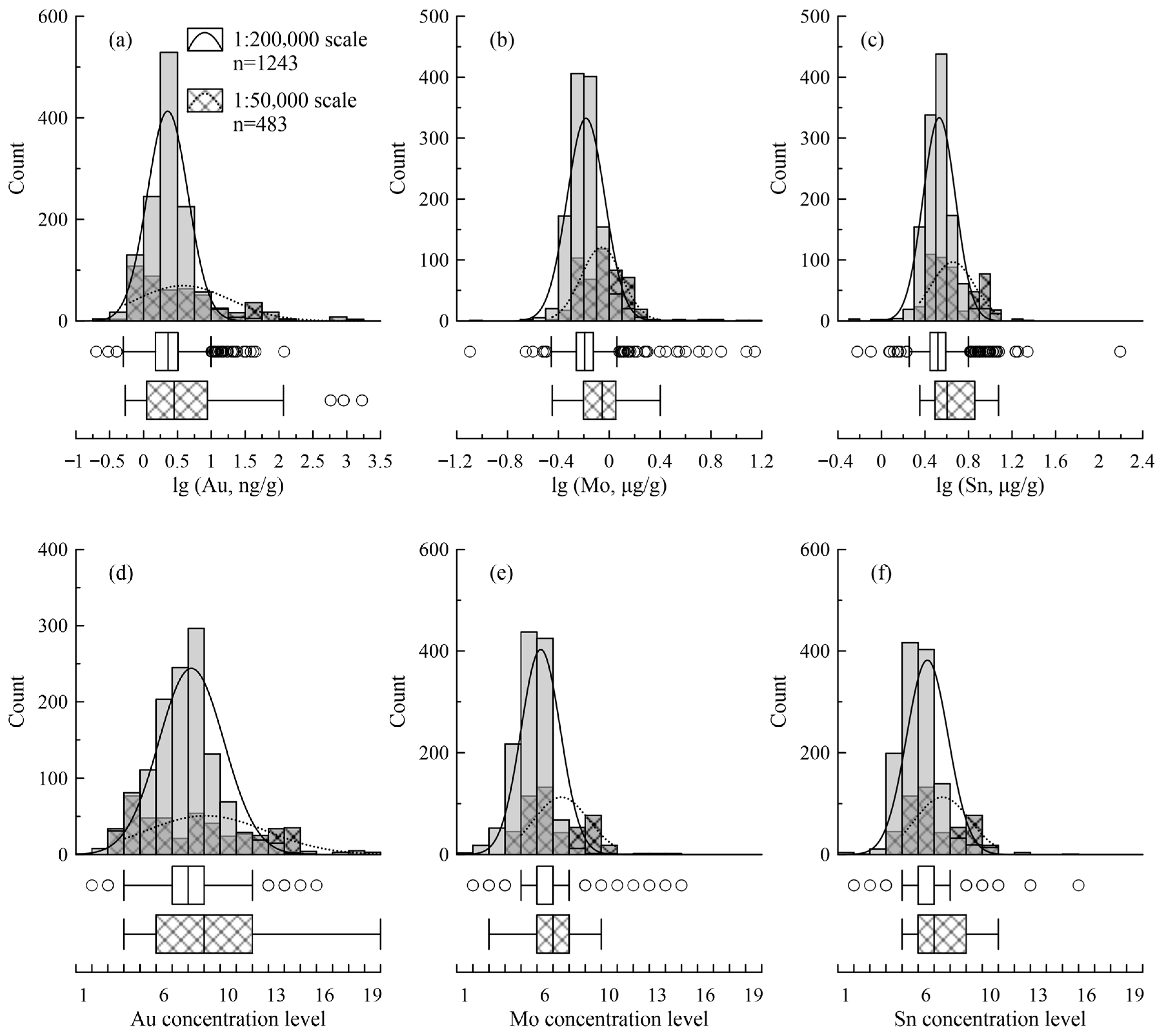 - The “ruler” for Au along with those for Mo and Sn has been applied to geochemical survey data on a 1:200,000 scale in the Zhongchuan area and on a 1:50,000 scale in the Jinshan region. The results show that elemental levels measured by the “ruler” can accurately indicate the background, anomalies, and mineralization of the elements, and comparisons among different elements, different regions, and different scales are applicable.