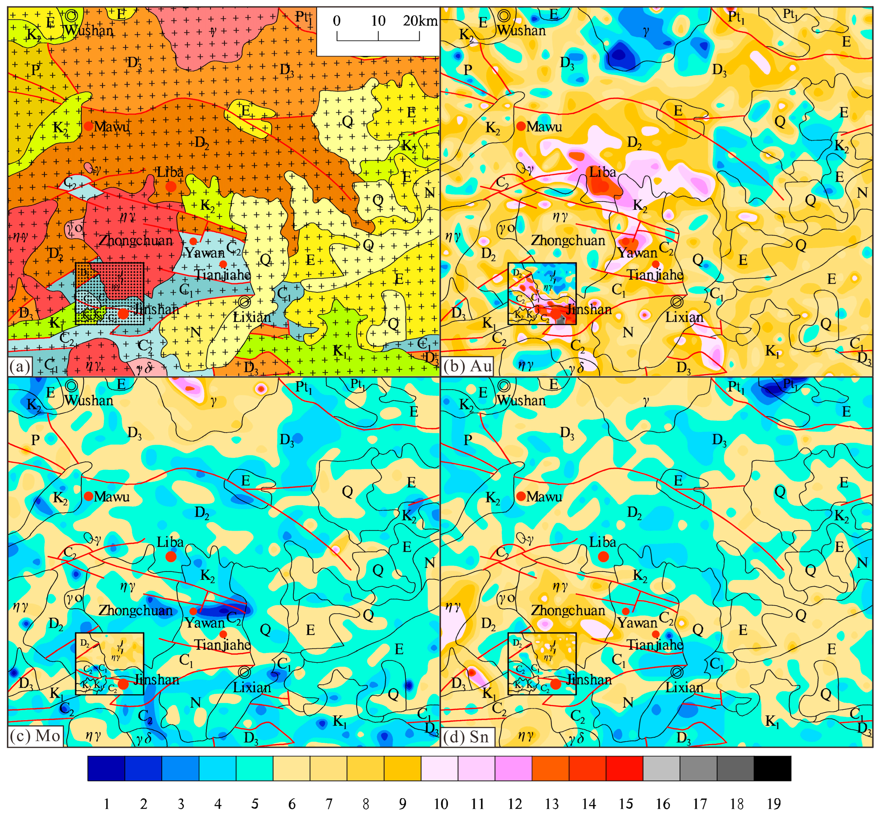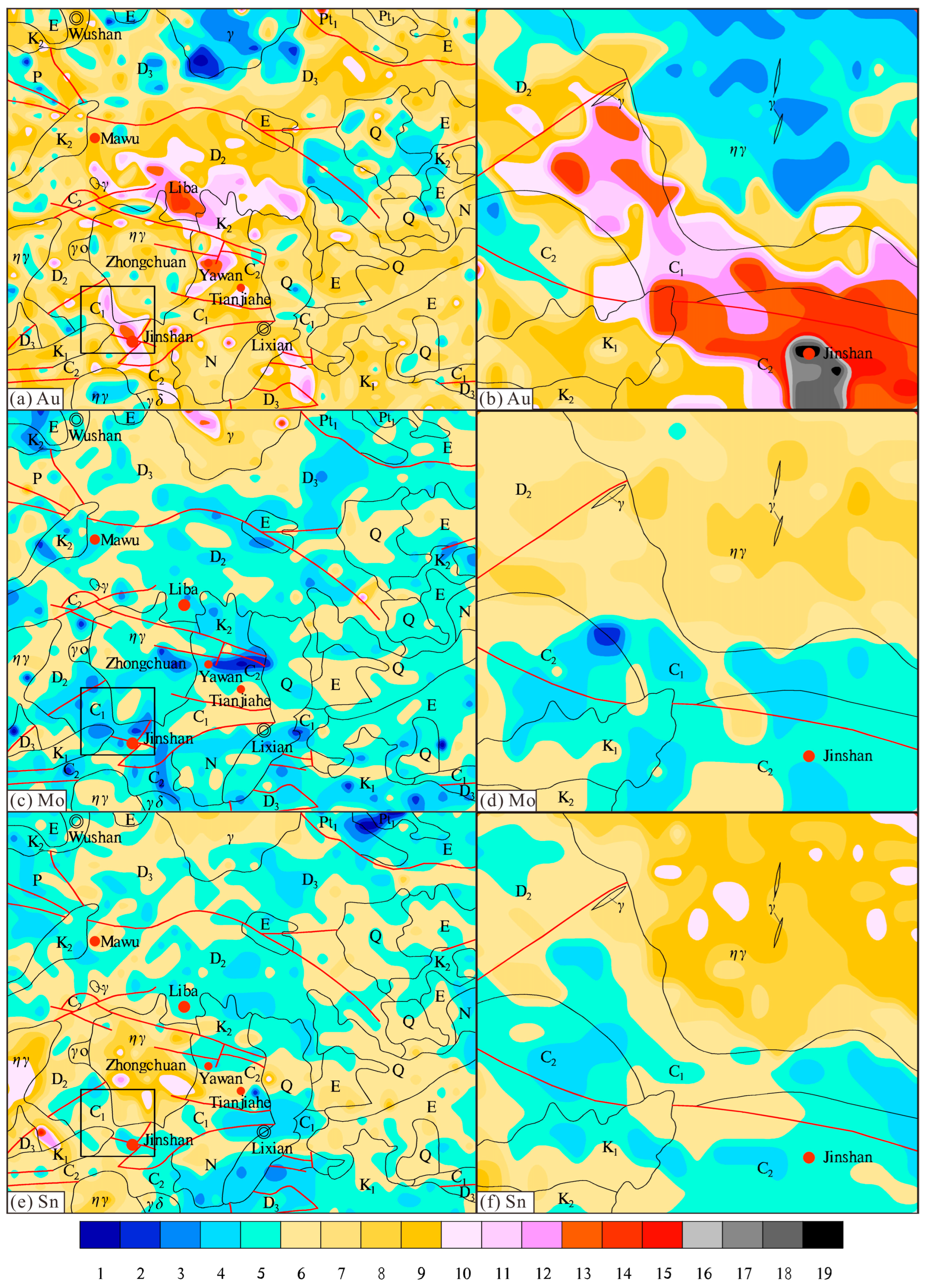 - Xu, S.; Li, J.; Zhang, X.; Huang, Z.; Huang, Y.; Long, Y.; Xu, Y.; Song, X.; Chen, Z.; Li, Y.; et al. Tin (Sn) geochemical mapping based on fixed-value method: A case illustration in Gejiu area, Southwest China. Appl. Sci. 2024, 14, 1765. [Google Scholar] [CrossRef]