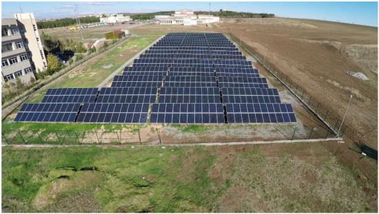 The Dicle University’s Solar Power Plant (DUSPP) is located at coordinates 40°16′ E longitude and 37°54′ N latitude, with a total installed capacity of 250 kWp. The plant comprises 1000 photovoltaic (PV) panels, each with a nominal capacity of 250 Wp, mounted southward at a tilt angle of 30°. Each module contains 60 solar cells, and the average nominal power obtained from actual measurements slightly exceeds the standard reference value, reaching 253.14 W [39]. An overview of the facility is provided in Figure 1.