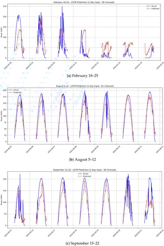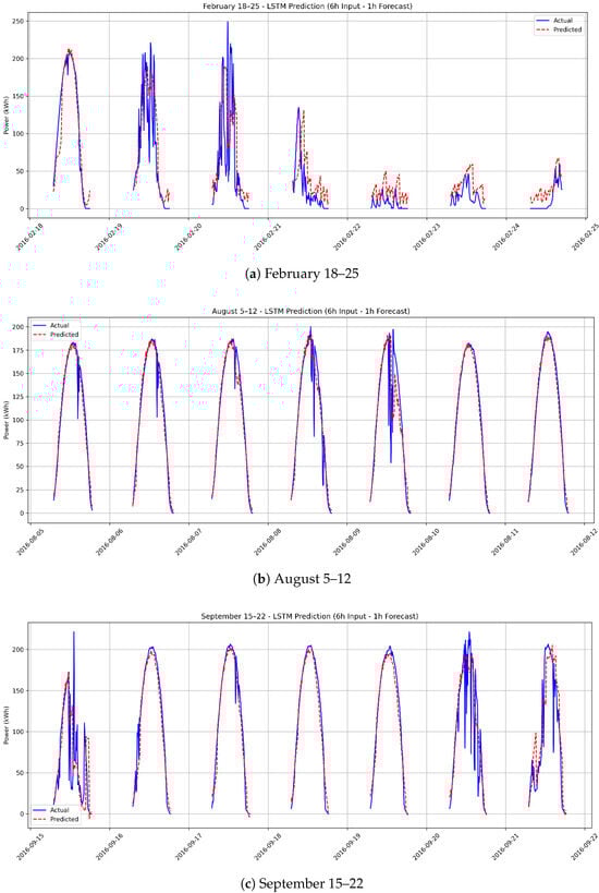 The time-series plots presented in Figure 7 illustrate one-hour-ahead forecasts based on six hours of actual power measurements for the months of February, August, and September. In all three time intervals, the model successfully captures the daily energy production cycles and overall temporal patterns.