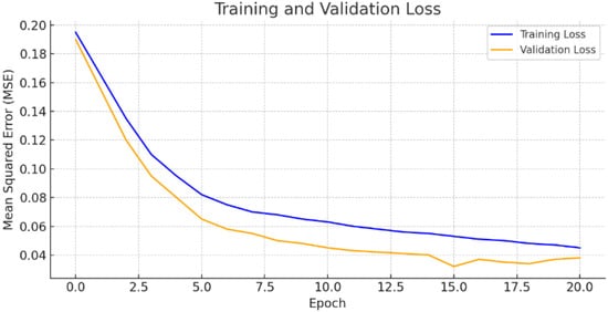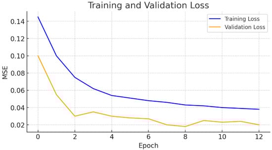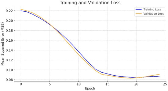 In this scenario, six-hour-ahead forecasting is performed using one full day (24 h) of real PV power data as input. The training and validation loss curves presented in Figure 8 were examined to assess the model’s learning process and generalization capability. The training loss is observed to start at a relatively high value and gradually decrease as the number of epochs increases, indicating successful adaptation to the training data. The validation loss, on the other hand, begins at a value close to the training loss, drops significantly during the early epochs, and then remains stable and low throughout the remaining training process.