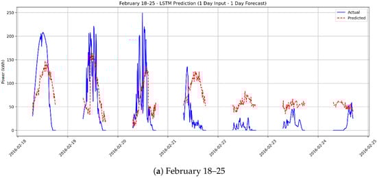 Figure 9a, representing February, reveals a more pronounced decline in forecasting accuracy, primarily due to variable and lower solar irradiance levels. Unpredictable weather variations during this period hindered the model’s ability to generate consistent forecasts based on previous day’s data, resulting in predictions that diverge more significantly from actual measurements.