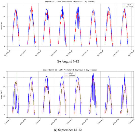 The forecast curves reveal noticeable delays and amplitude mismatches compared to sudden spikes and drops in actual power values. These discrepancies indicate that the model struggles to accurately predict rapid intra-day changes, particularly when relying on data from the previous day. Figure 11b,c, which correspond to August and September, respectively, show that even under relatively stable weather conditions, the model exhibits limitations in accurately capturing peak power values and abrupt fluctuations. Forecasted peak values often deviate from the true peaks, and sudden rises or drops in PV output are not adequately captured by the model.