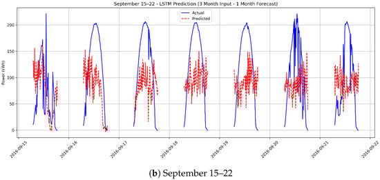 Figure 13a, corresponding to the period August 5–12, demonstrates that the model faces considerable difficulty in tracking actual power values over long-term (one-month-ahead) forecasting horizons. The prediction curve exhibits pronounced high-frequency noise, amplitude mismatches, and phase shifts. These artifacts indicate that the model’s ability to accurately project future trends using past three-month patterns is limited. These observed fluctuations and phase shifts suggest that while the model captures general seasonal trends, its capacity to generalize long-range temporal dependencies diminishes over extended horizons, leading to increased noise during peak irradiance hours. Similarly, Figure 13b, representing the period September 15–22, confirms the model’s low performance in long-term forecasting. The predictions fail to follow the overall shape of the actual power curve, resulting in an irregular and chaotic output. Significant deviations and timing errors are particularly observed at peak and trough points, highlighting the model’s inadequacy in maintaining accuracy over extended forecast horizons.