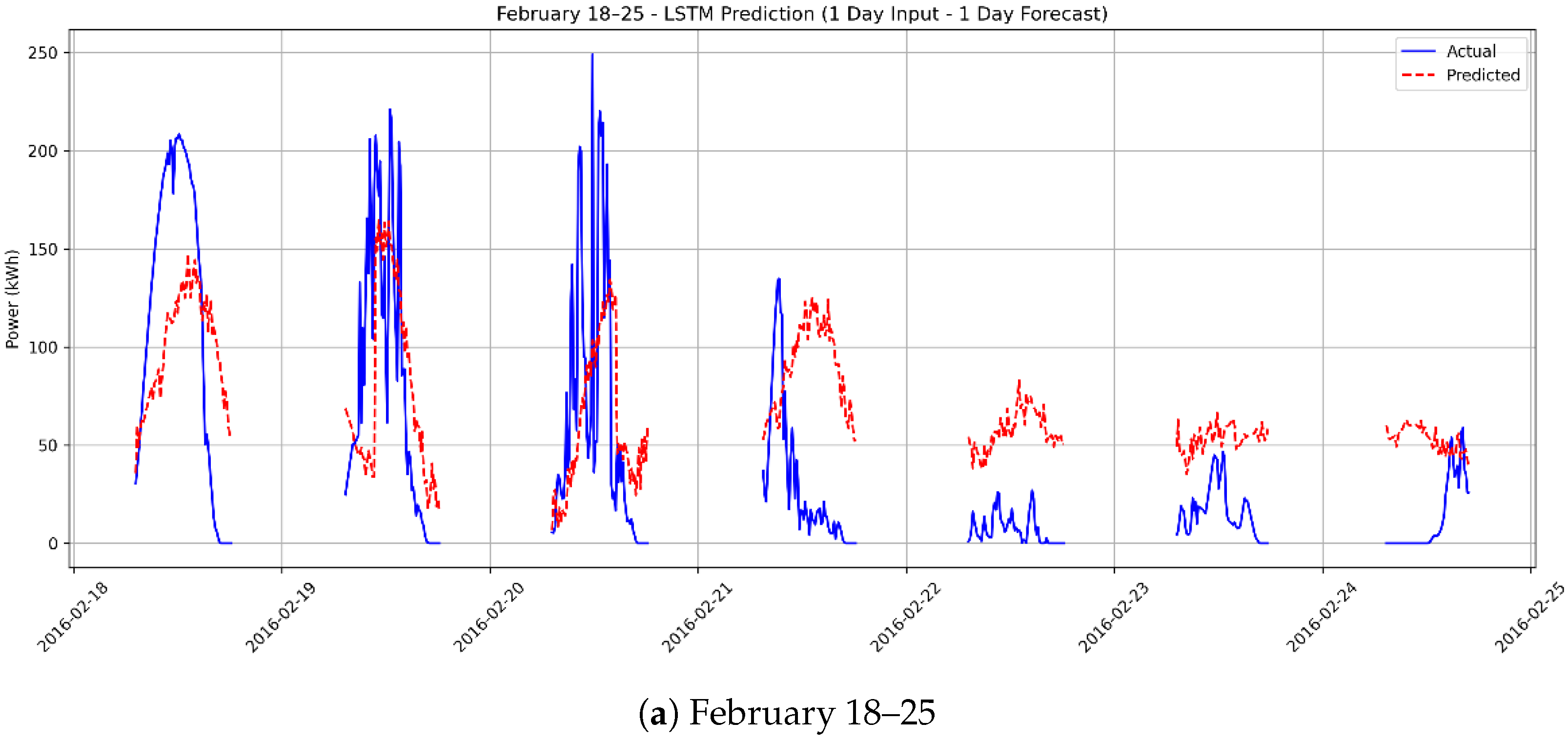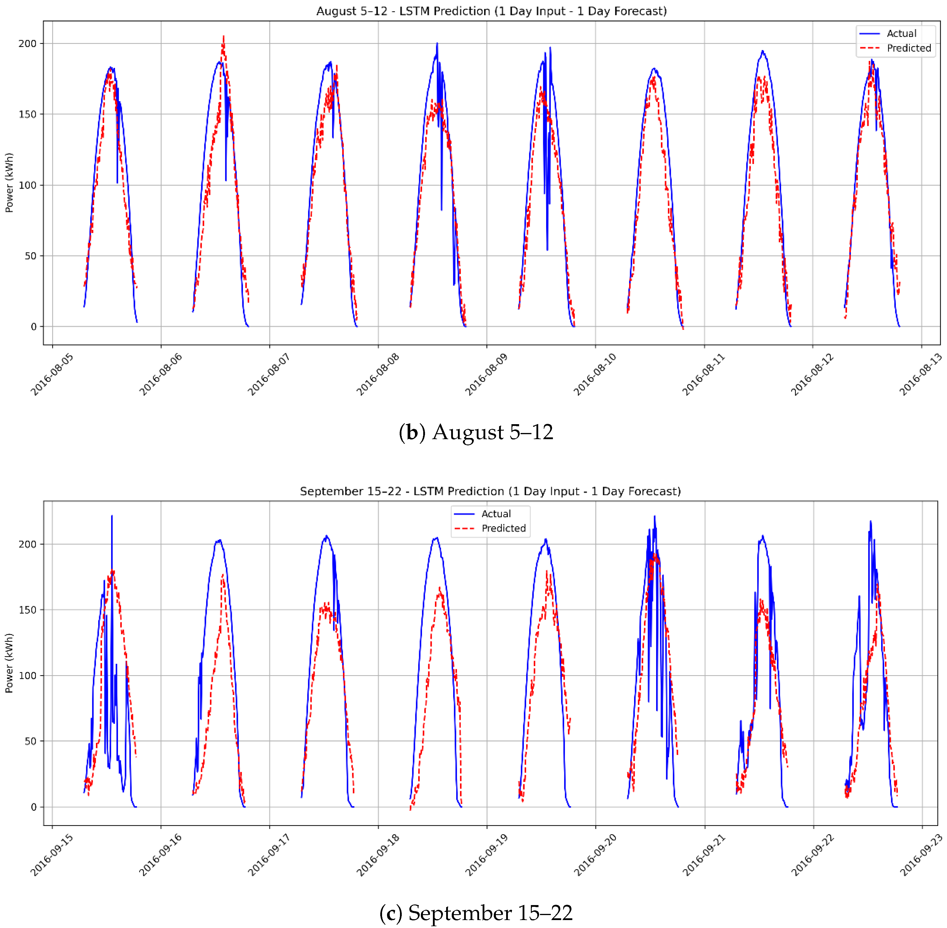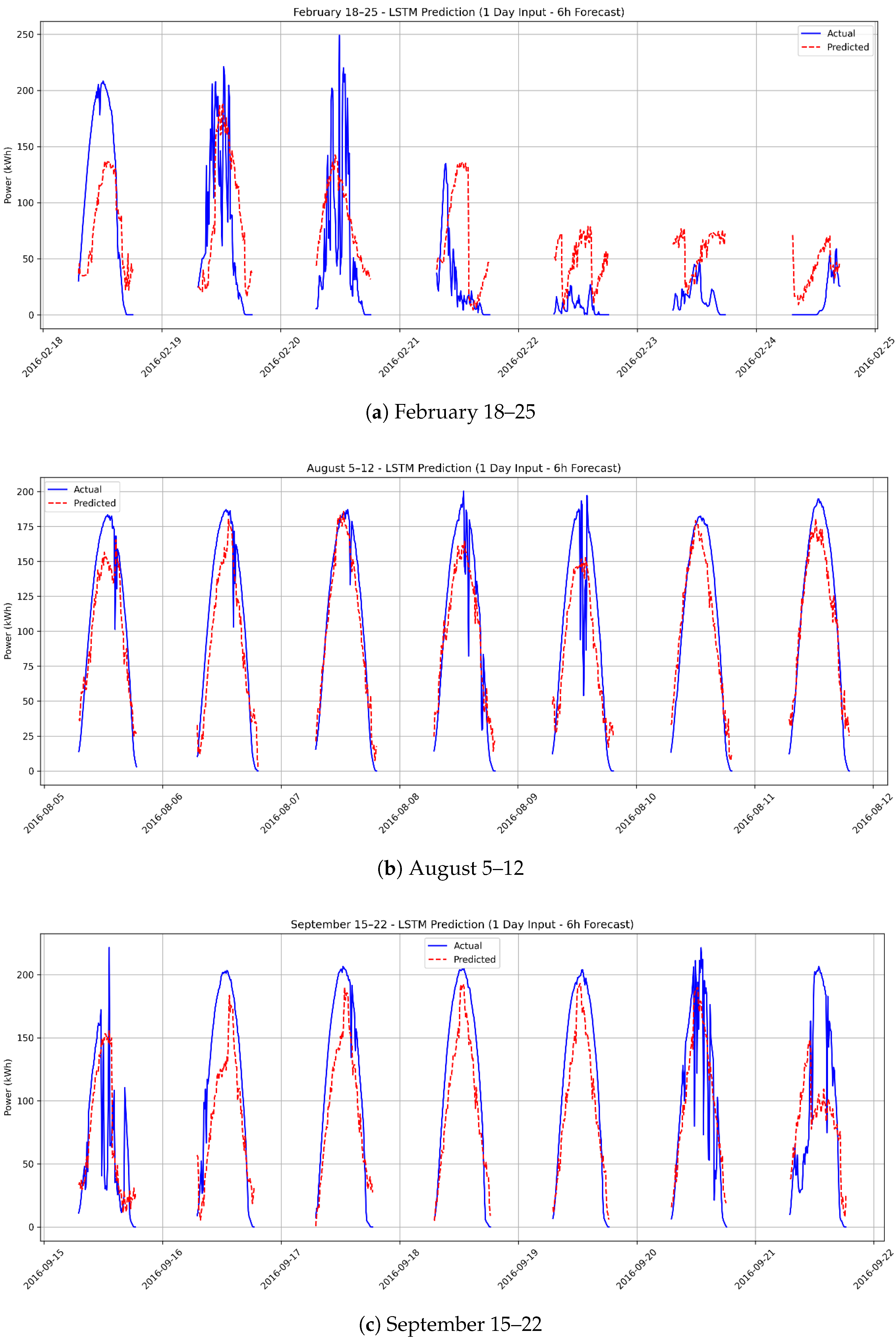 - Mauladdawilah, H.; Balfaqih, M.; Balfagih, Z.; Pegalajar, M.d.C.; Gago, E.J. Deep Feature Selection of Meteorological Variables for LSTM-Based PV Power Forecasting in High-Dimensional Time-Series Data. Algorithms 2025, 18, 496. [Google Scholar] [CrossRef]