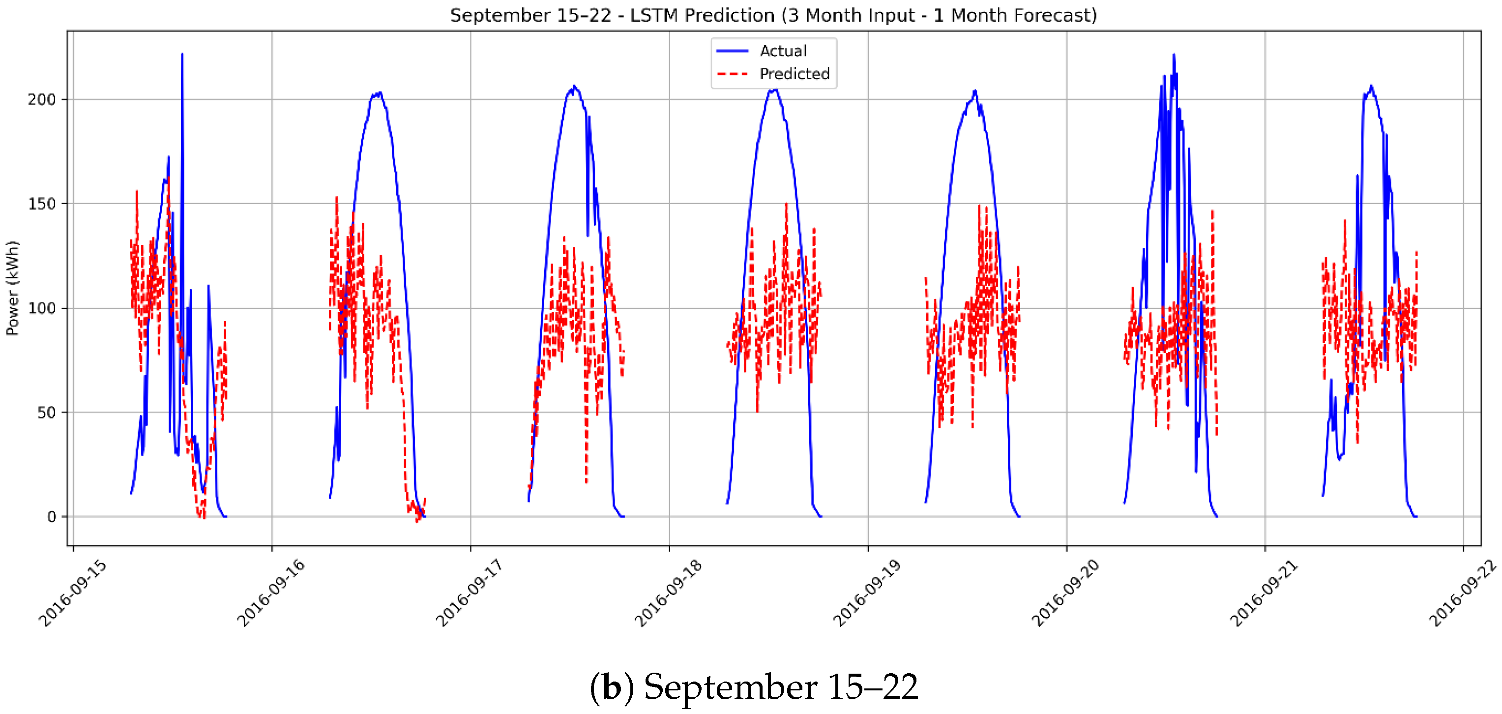 - Joo, Y.; Kim, D.; Noh, Y.; Choi, J.; Lee, J. Performance Comparison of LSTM and ESN Models in Time-Series Prediction of Solar Power Generation. Sustainability 2025, 17, 8538. [Google Scholar] [CrossRef]