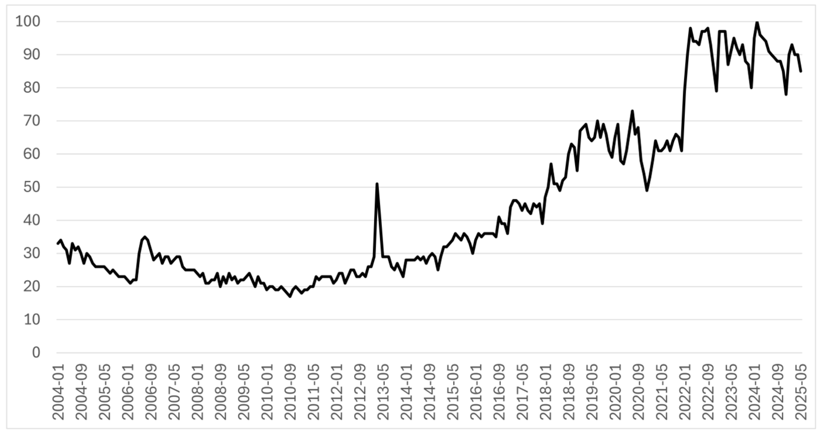 Figure 1 shows the relative search volume over time, with 100 representing the peak interest in the observed period [