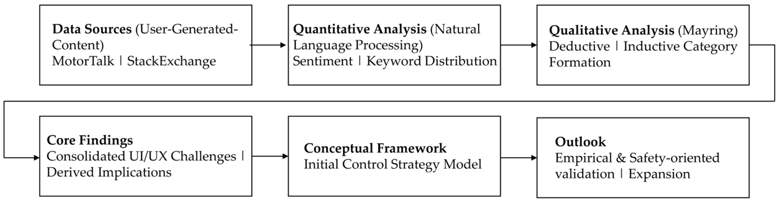 The study’s primary objective is to identify additional challenges and to convert these insights into actionable implications. Based on an analysis of UGC from automotive-focused online forums, this study develops a conceptual framework to guide user-centered interaction strategies. The proposed framework is intended to provide a strategic basis for creating intuitive in-vehicle experiences. The central research questions addressed are: What key challenges in automotive UX emerge from user feedback in online forums? What implications can be derived to support the transition from active driver to passive passenger in the context of increasing driving automation?