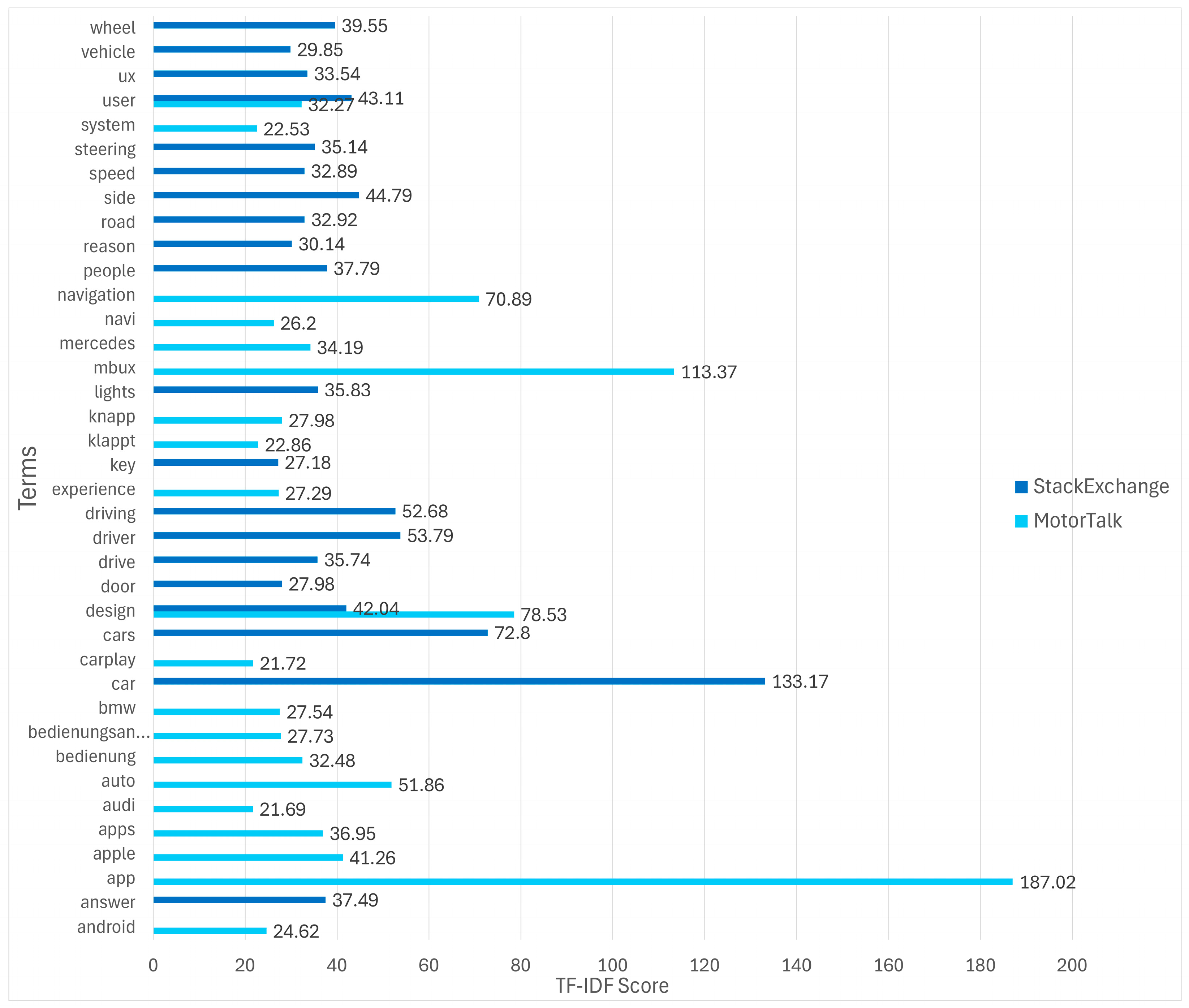 26] focusing on UX-related car topics, were selected. The choice was guided by their high thematic relevance, active and diverse user communities, and public availability of their content. The two forums provide a solid foundation for the first analysis phase of this study. The forum quotations are processed in anonymized form, with orthographic errors corrected for readability without altering the original meaning. All German quotations were translated into English by the author to ensure consistency and accessibility. Moreover, all analytical procedures—including preprocessing, TF-IDF computation, and sentiment classification—were documented within a Jupyter Notebook version 7.3.3 [