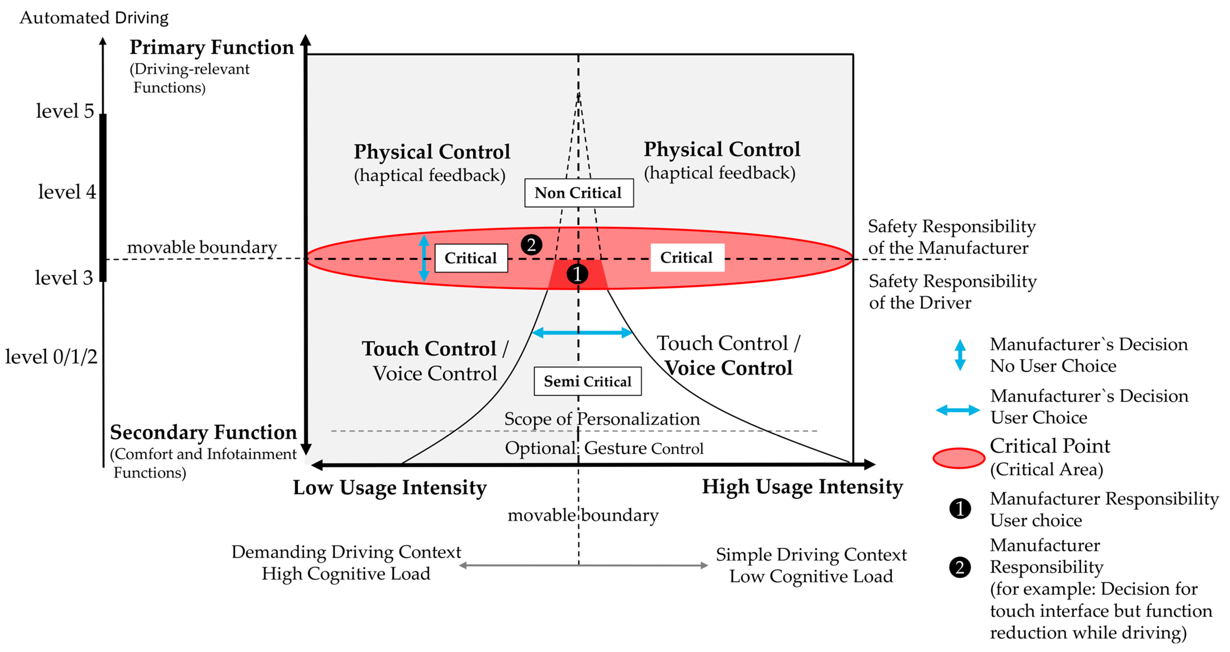 At the core of the model is the area surrounding the critical point, illustrated by a red-highlighted ellipse. This point represents the intersection of high usage frequency and safety-critical functionality. Within this zone, the requirements for human–machine interface (HMI) are particularly high: the design must be robust, intuitive, and unambiguous. User personalization is not recommended, as an inappropriate choice of interaction mode for essential driving functions—such as relying exclusively on touch input—can create significant risks of distraction or even endangerment. In this domain, responsibility lies primarily with the manufacturer and system design.