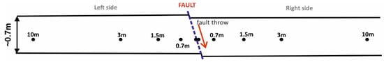 Schematic sampling layout in seam 306/1; sampling points are marked with black dots together with their distance from the fault fissure in meters.