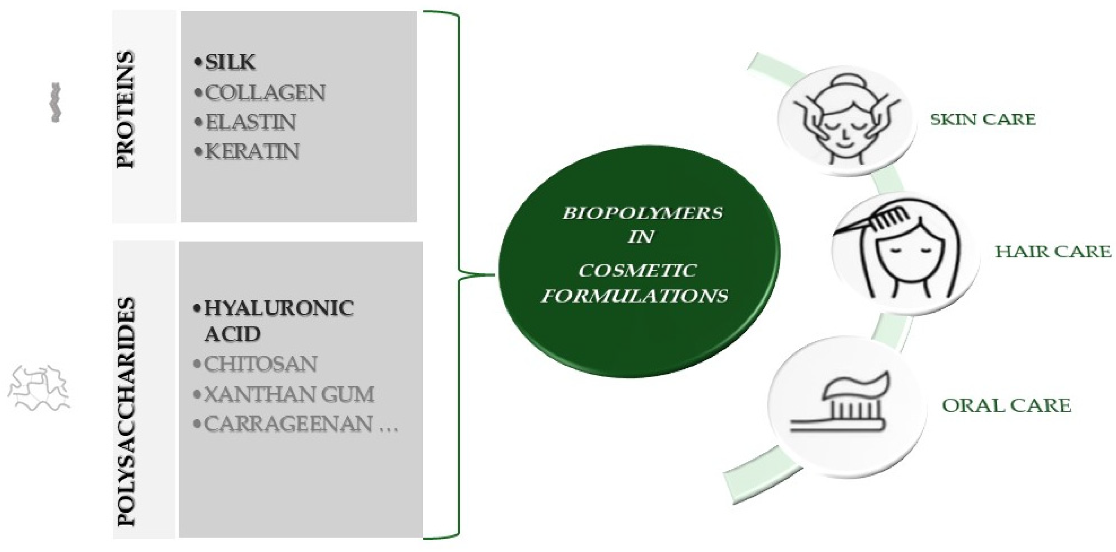 - Mendoza-Muñoz, N.; Leyva-Gómez, G.; Piñón-Segundo, E.; Zambrano-Zaragoza, M.L.; Quintanar-Guerrero, D.; Del Prado Audelo, M.L.; Urbán-Morlán, Z. Trends in Biopolymer Science Applied to Cosmetics. Int. J. Cosmet. Sci. 2023, 45, 699–724. [Google Scholar] [CrossRef]