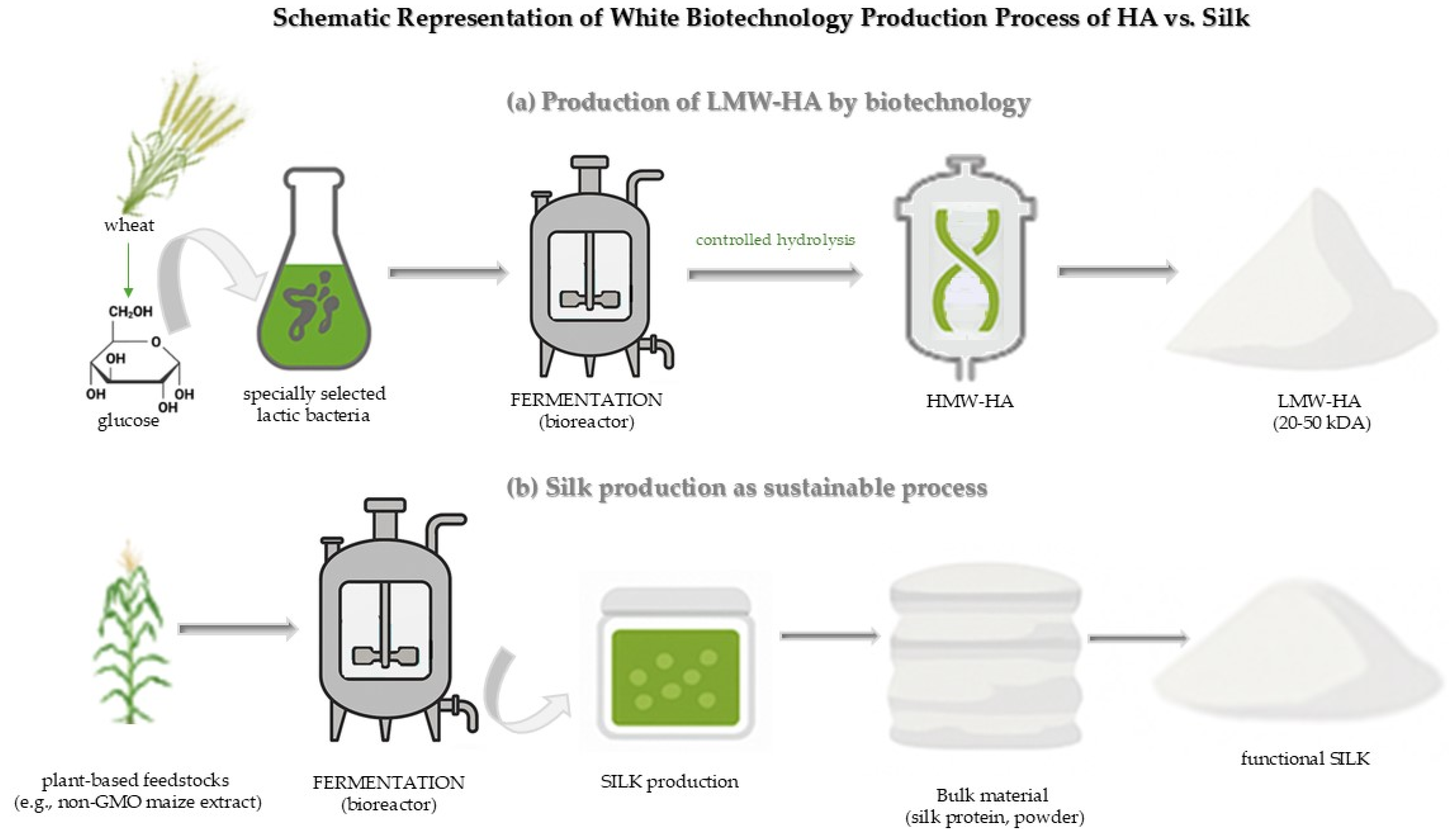| Principal sources | microbial fermentation, animal-derived tissues: rooster combs (historically a major source); vitreous humor (bovine or porcine eyes); umbilical cord/synovial fluid [74] | silkworm (Bombyx mori) cocoons [88,89] |