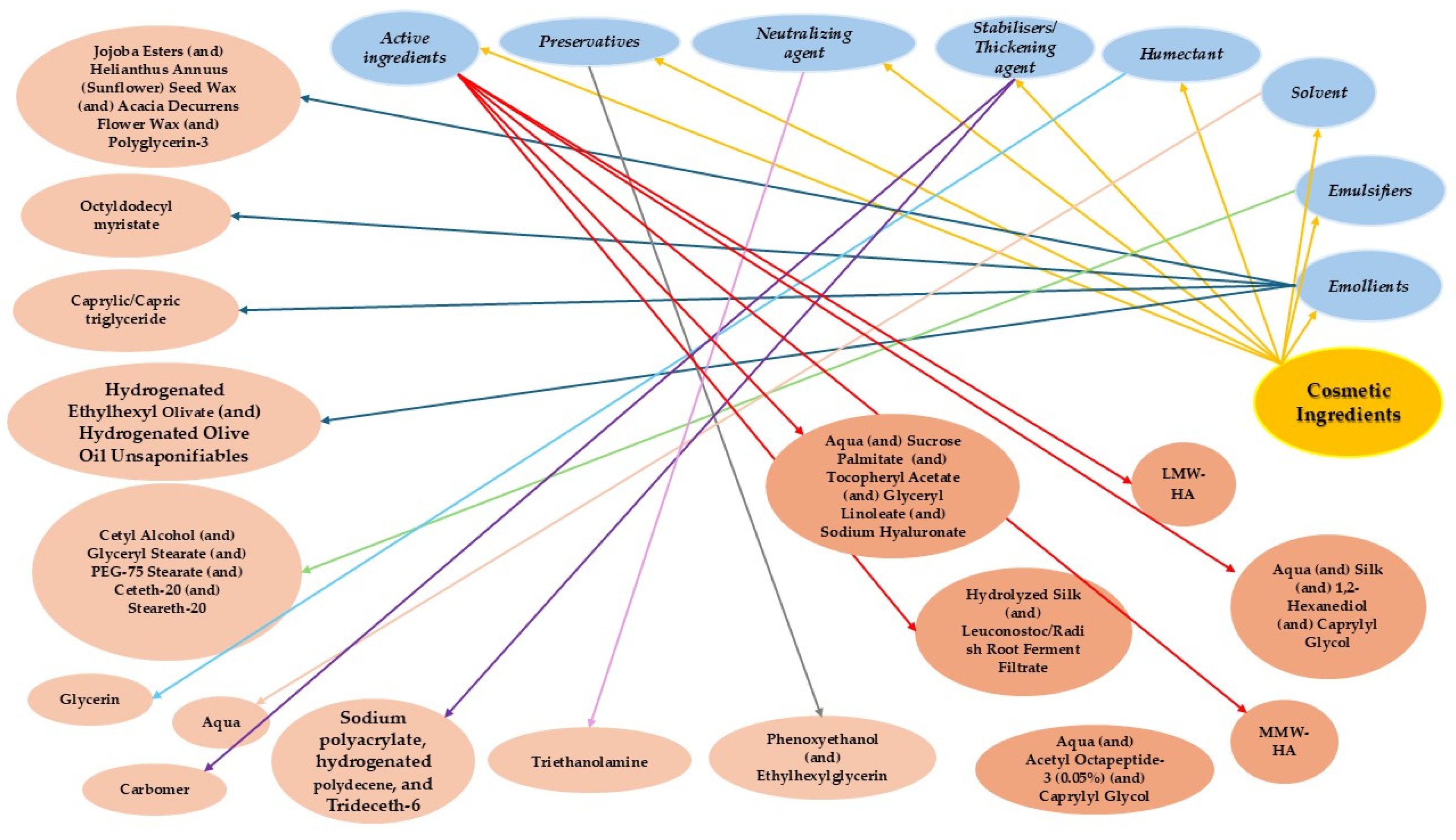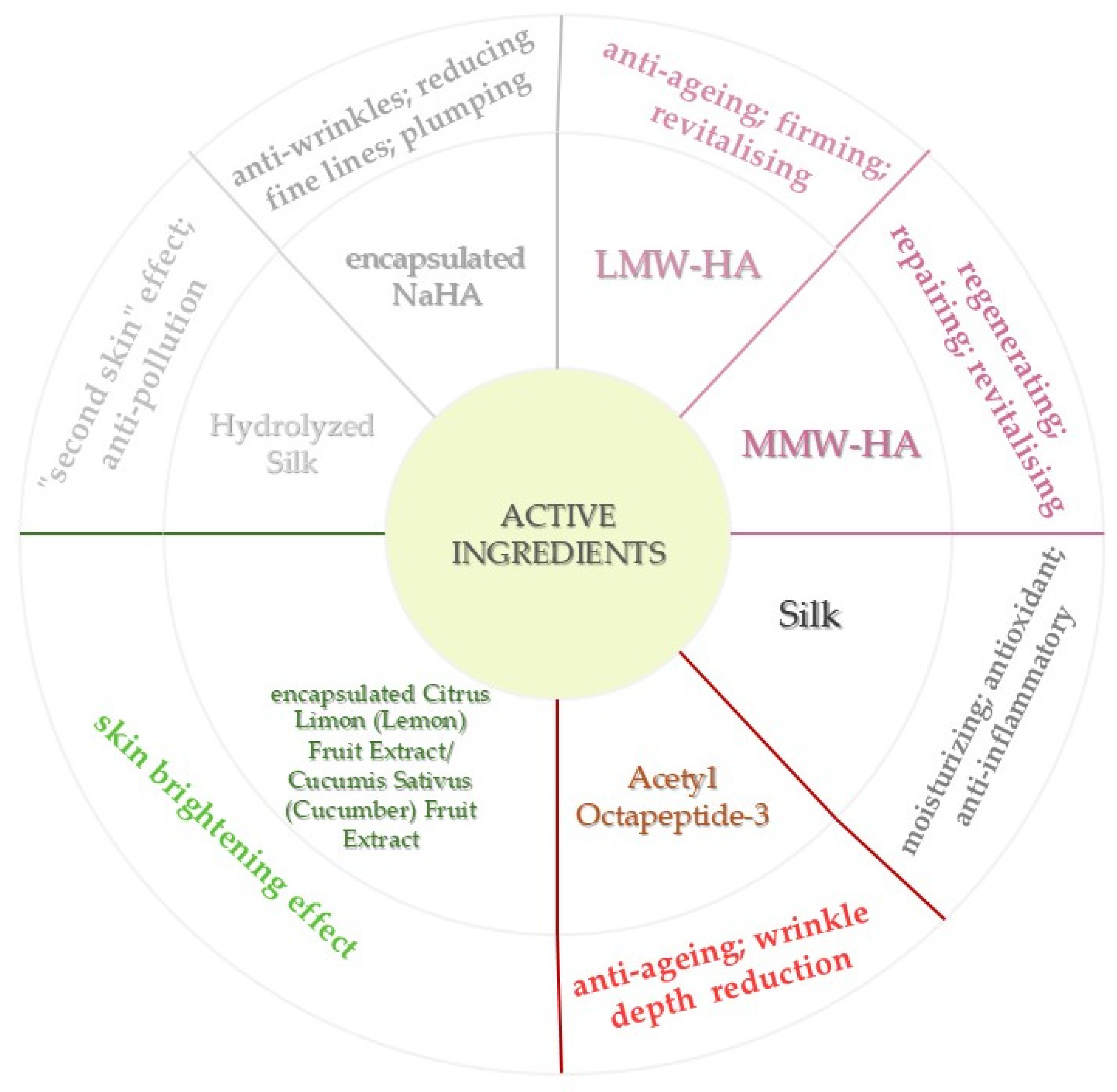 | Actives/Skin conditioning | LMW-HA (20–50 kDa) (PrimalHyal 50, Givaudan, France) | anti-ageing, skin firmness and elasticity improvement, skin roughness reduction | [32,72,73,74] |