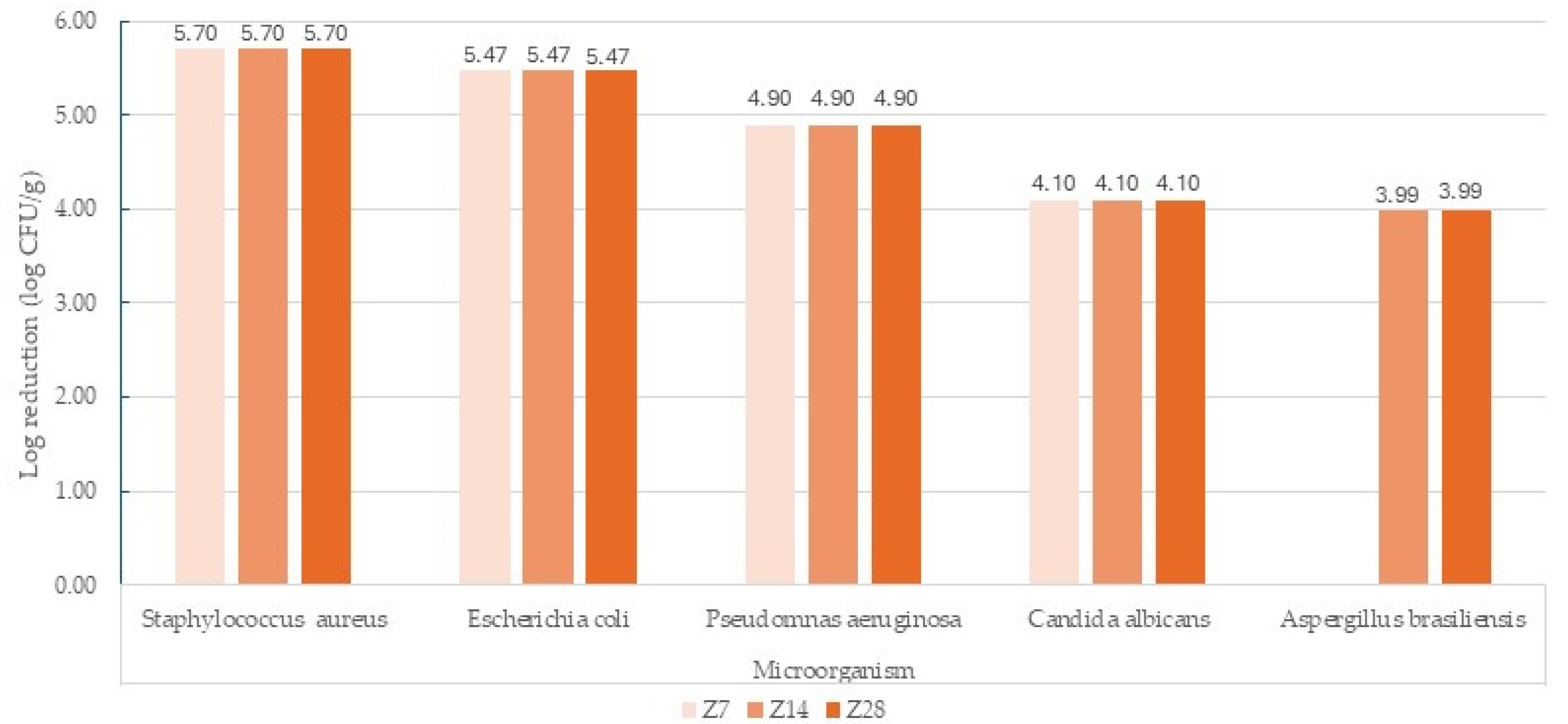 - Preservative Efficacy Test (Challenge Test): This critical test evaluated the ability of the formulation’s preservative system (Phenoxyethanol and Ethylhexylglycerin) to inhibit microbial growth during product usage and storage. Conducted per PN EN ISO 11930:2012 standards [104], this 28-day test involved intentionally contaminating the developed cream with a specific concentration of microorganisms and then monitoring microbial reduction over time [48,52].