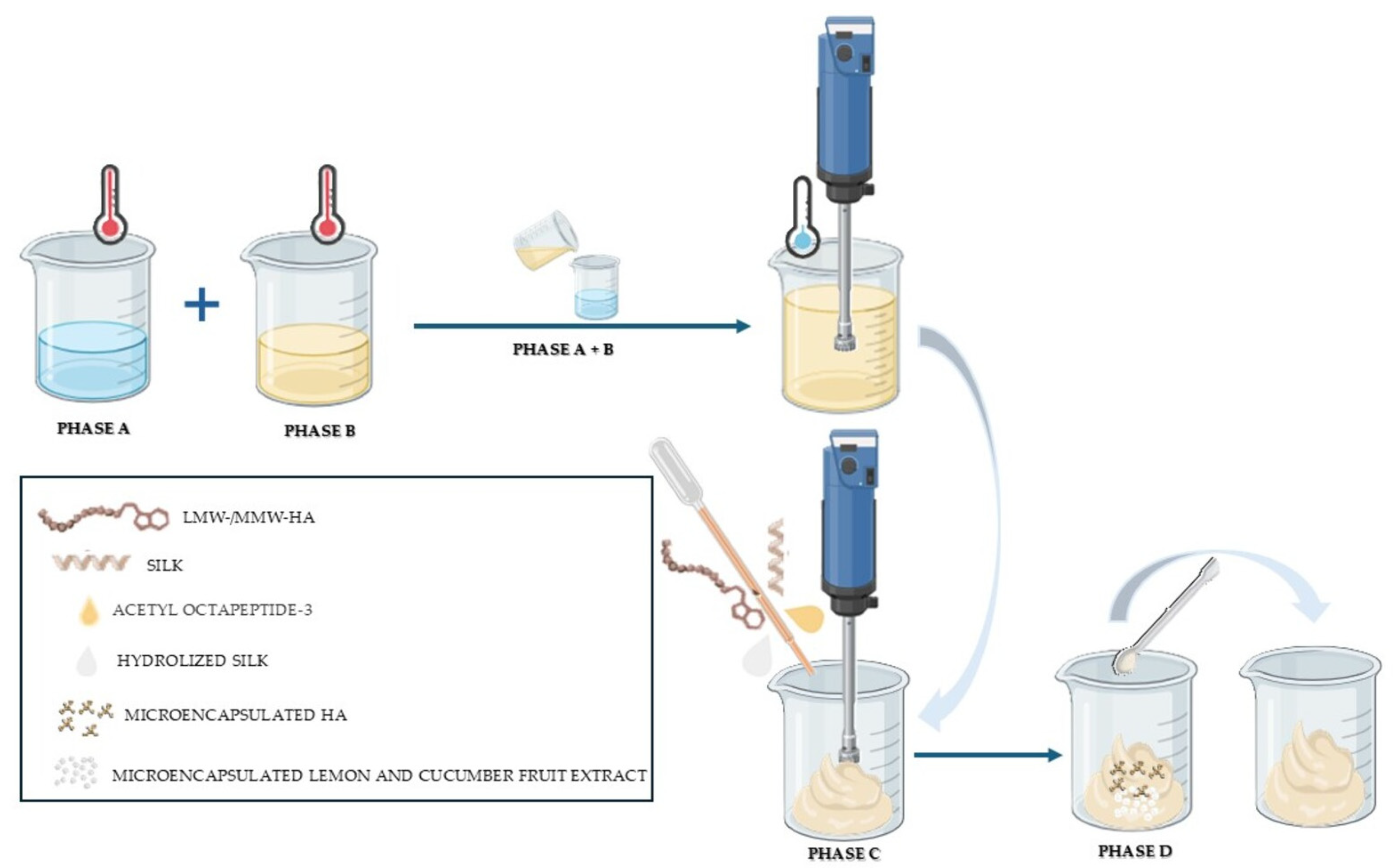 4.2. Formulation Design, Composition and Manufacturing Process of the HA and Silk-Based Anti-Ageing Cream