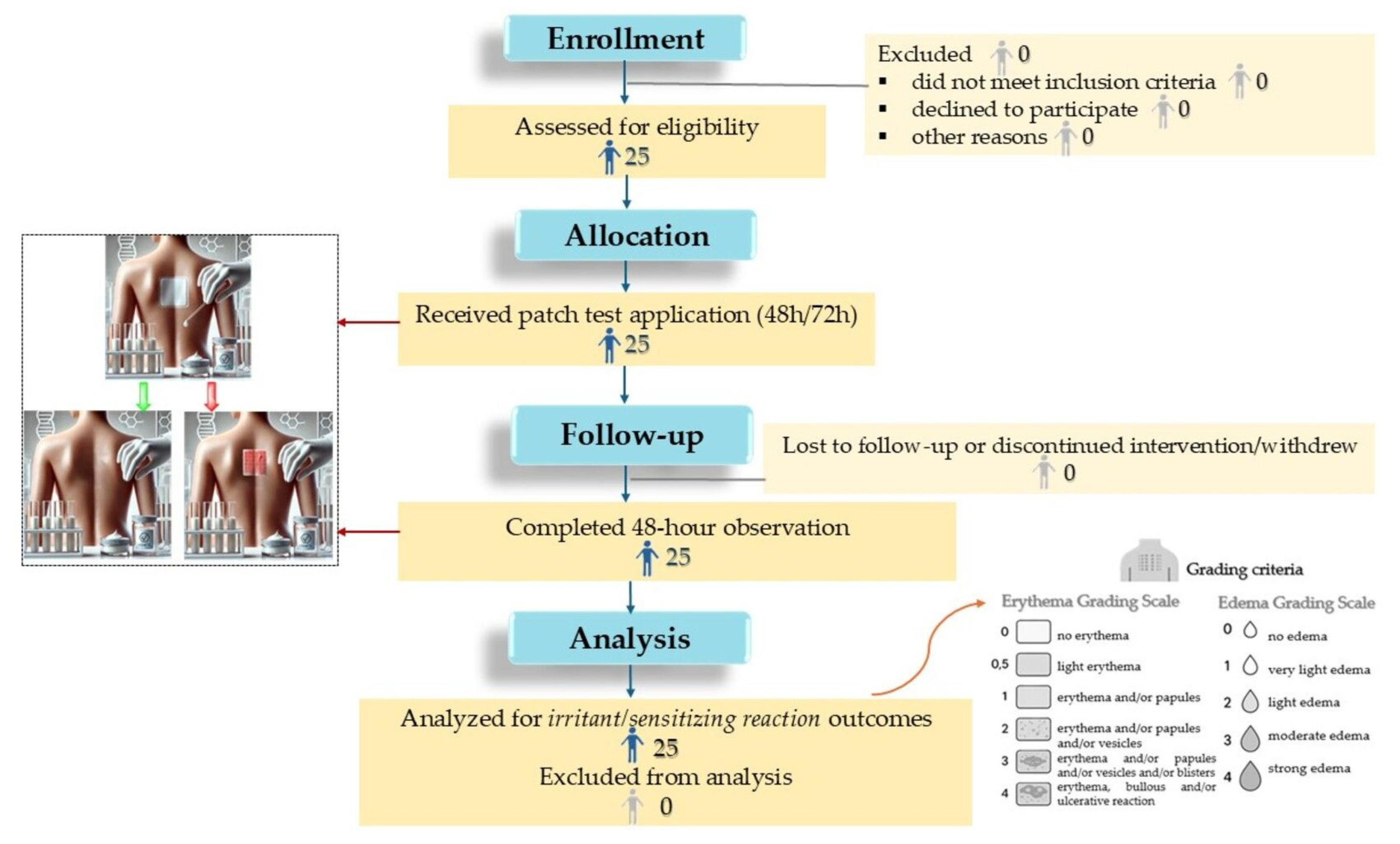 - Walker, A.P.; Basketter, D.A.; Baverel, M.; Diembeck, W.; Matthies, W.; Mougin, D.; Paye, M.; Rothlisberger, R.; Dupuis, J. Test Guidelines for Assessment of Skin Compatibility of Cosmetic Finished Products in Man. Food Chem. Toxicol. 1996, 34, 651–660. [Google Scholar] [CrossRef] [PubMed]
