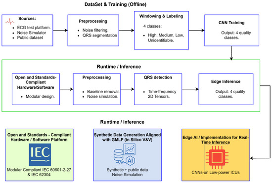 Regulation-aligned development pipeline integrating hardware and software acquisition, in silico validation, and embedded AI deployment. The upper section depicts the Dataset and Training phase, while the lower section illustrates the Runtime and Inference phase for real-time ECG quality classification.