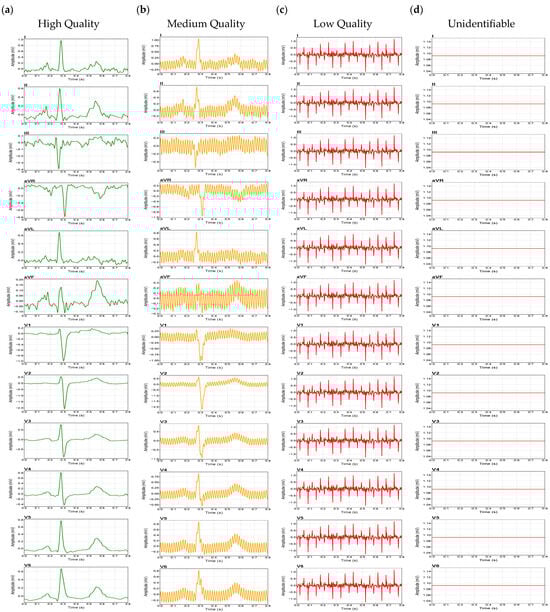 Representative ECG waveforms for the four quality classes: (a) High Quality, (b) Medium Quality, (c) Low Quality, (d) Unidentifiable.