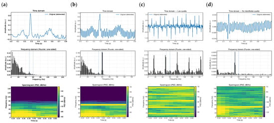 Graphical Representation of the Spectrogram for Each ECG Class. The figure illustrates the time-domain waveform segmented into 0,8 s windows, alongside the frequency spectrum computed using FFT to quantify noise levels for each quality category: (a) High Quality, (b) Medium Quality, (c) Low Quality, and (d) Unidentifiable.