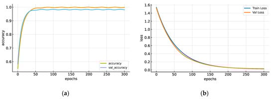 Accuracy refers to the proportion of correctly classified samples relative to the total number of classifications, whereas training accuracy indicates the model’s performance on the training dataset. Figure 5a presents the accuracy trends for both training and validation sets, achieving final accuracies of 0.9968 and 0.9784, respectively. The blue curve denotes training accuracy, while the orange curve represents the validation accuracy. Figure 5b illustrates the loss evolution over 300 epochs, showing convergence between training (Train_loss, blue) and validation (Val_loss, orange) losses, both approaching zero.